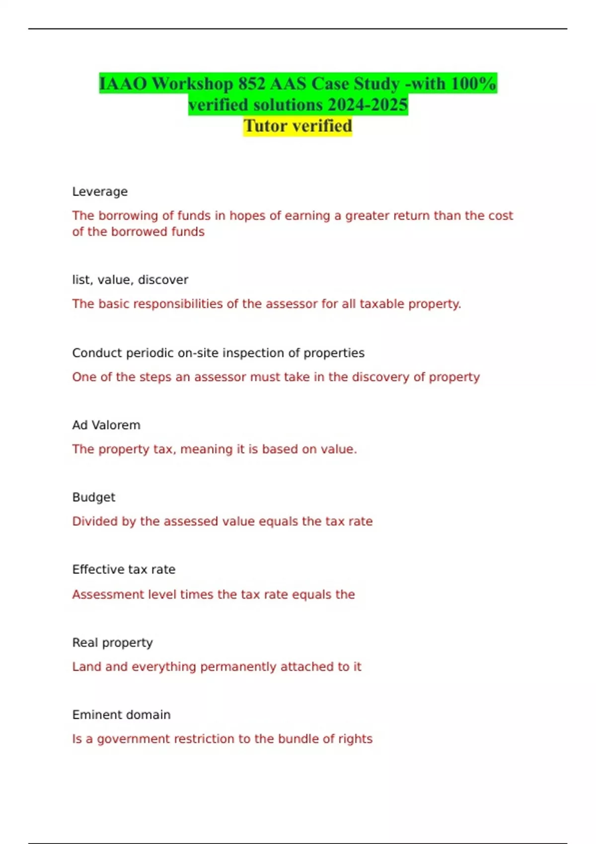IAAO Workshop 852 AAS Case Study -with 100% verified solutions Tutor verified