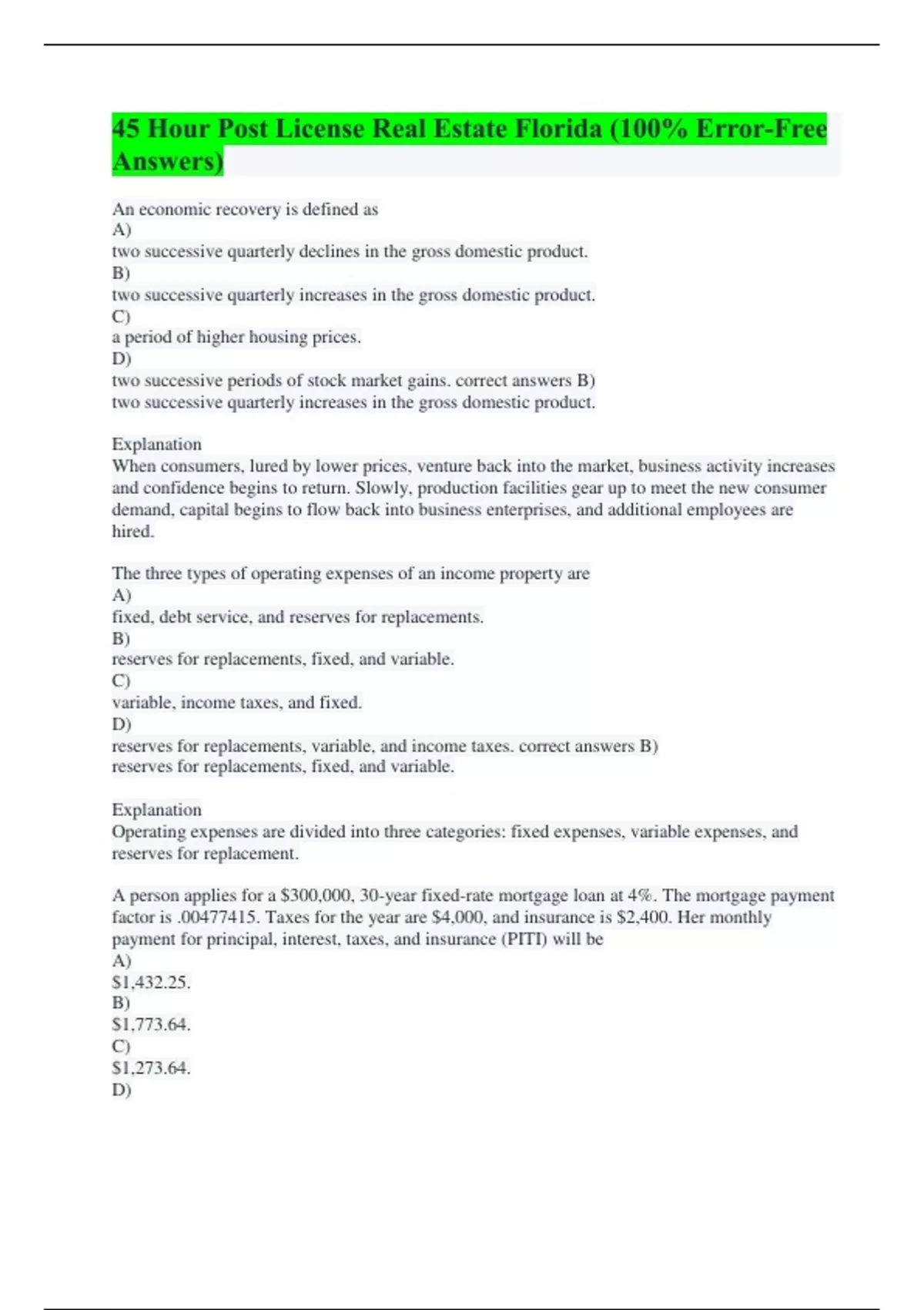 An economic recovery is defined as A) two successive quarterly declines in the gross domestic product. B) two successive quarterly increases in the gross domestic product. C) a period of higher housing prices. D) two successive periods of stock market gains. correct answers B) two successive quarterly increases in the gross domestic product. Explanation When consumers, lured by lower prices, venture back into the market, business activity increases and confidence begins to return. Slowly, production facilities gear up to meet the new consumer demand, capital begins to flow back into business enterprises, and additional employees are hired. The three types of operating expenses of an income property are A) fixed, debt service, and reserves for replacements. B) reserves for replacements, fixed, and variable. C) variable, income taxes, and fixed. D) reserves for replacements, variable, and income taxes. correct answers B) reserves for replacements, fixed, and variable. Explanation Operating expenses are divided into three categories: fixed expenses, variable expenses, and reserves for replacement. A person applies for a $300,000, 30-year fixed-rate mortgage loan at 4%. The mortgage payment factor is .. Taxes for the year are $4,000, and insurance is $2,400. Her monthly payment for principal, interest, taxes, and insurance (PITI) will be A) $1,432.25. B) $1,773.64. C) $1,273.64. D)$1,965.58. correct answers D) $1,965.58. 58. $300,000 × . = $1,432.25 principal and interest. $4,000 taxes ÷ 12 months = 333.33. $2,400 insurance ÷ 12 months = 200. $1,432.25 + $333.33 + $200 = $1,965.58 total PITI. A sales associate receives a good-faith deposit from a buyer on Wednesday. The broker must deposit the funds into the escrow account no later than the following A) Tuesday. B) Monday. C) Thursday. D) Friday. correct answers B) Monday.