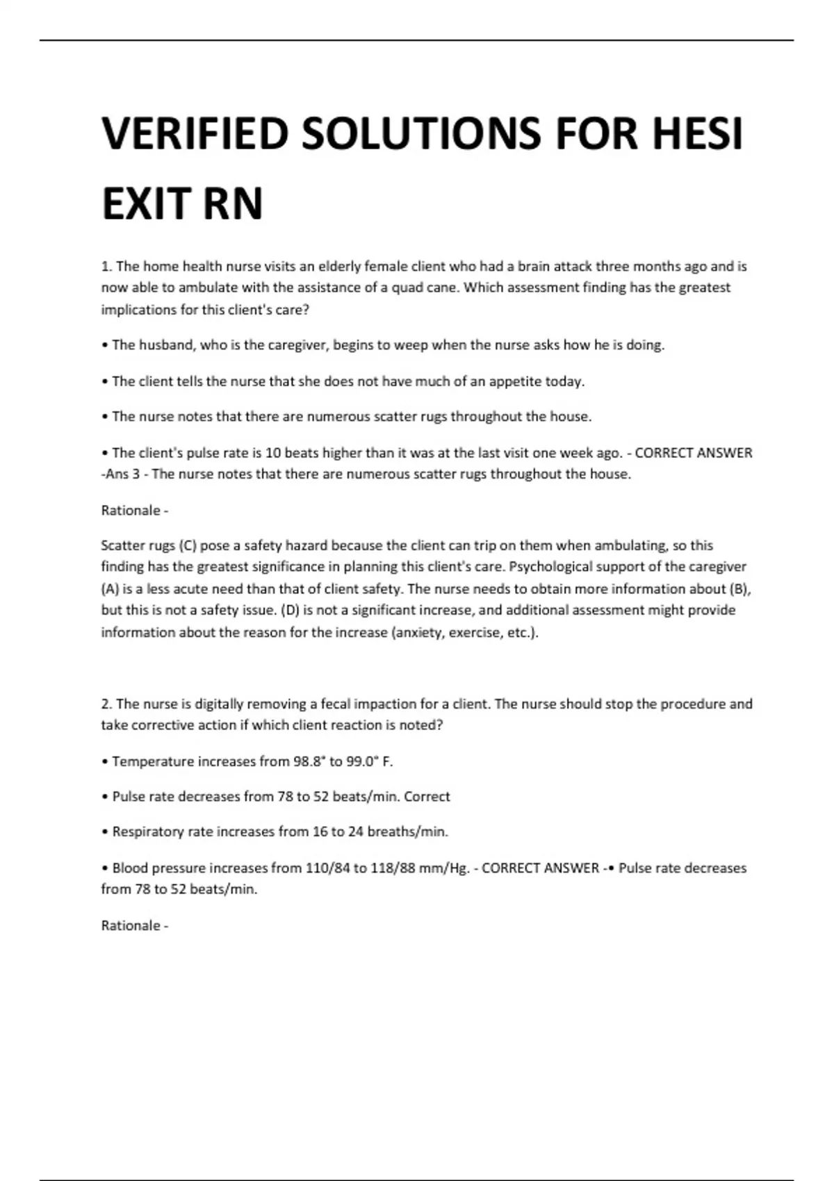 VERIFIED SOLUTIONS FOR HESI EXIT RN 1. The home health nurse visits an elderly female client who had a brain attack three months ago and is now able to ambulate with the assistance of a quad cane. Which assessment finding has the greatest implications for this client's care? • The husband, who is the caregiver, begins to weep when the nurse asks how he is doing. • The client tells the nurse that she does not have much of an appetite today. • The nurse notes that there are numerous scatter rugs throughout the house. • The client's pulse rate is 10 beats higher than it was at the last visit one week ago. - CORRECT ANSWER -Ans 3 - The nurse notes that there are numerous scatter rugs throughout the house. Rationale - Scatter rugs (C) pose a safety hazard because the client can trip on them when ambulating, so this finding has the greatest significance in planning this client's care. Psychological support of the caregiver (A) is a less acute need than that of client safety. The nurse needs to obtain more information about (B), but this is not a safety issue. (D) is not a significant increase, and additional assessment might provide information about the reason for the increase (anxiety, exercise, etc.). 2. The nurse is digitally removing a fecal impaction for a client. The nurse should stop the procedure and take corrective action if which client reaction is noted? • Temperature increases from 98.8° to 99.0° F. • Pulse rate decreases from 78 to 52 beats/min. Correct • Respiratory rate increases from 16 to 24 breaths/min. • Blood pressure increases from 110/84 to 118/88 mm/Hg. - CORRECT ANSWER -• Pulse rate decreases from 78 to 52 beats/min. Rationale - Parasympathetic reaction can occur as a result of digital stimulation of the anal sphincter, which should be stopped if the client experiences a vagal response, such as bradycardia (B). (A, C, and D) do not warrant stopping the procedure. 3. The nurse is providing passive range of motion (ROM) exercises to the hip and knee for a client who is unconscious. After supporting the client's knee with one hand, what action should the nurse take next? • Raise the bed to a comfortable working level. • Bend the client's knee. • Move the knee toward the chest as far as it will go. • Cradle the client's heel. Correct - CORRECT ANSWER -•Ans - Cradle the client's heel. Correct Passive ROM exercise for the hip and knee is provided by supporting the joints of the knee and ankle (D) and gently moving the limb in a slow, smooth, firm but gentle manner. (A) should be done before the exercises are begun to prevent injury to the nurse and client. (B) is carried out after both joints are supported. After the knee is bent, then the knee is moved toward the chest to the point of resistance (C) two or three times. 4. A client who has moderate, persistent, chronic neuropathic pain due to diabetic neuropathy takes gabapentin (Neurontin) and ibuprofen (Motrin, Advil) daily. If Step 2 of the World Health Organization (WHO) pain relief ladder is prescribed, which drug protocol should be implemented? • Continue gabapentin. Correct • Discontinue ibuprofen. • Add aspirin to the protocol. Add oral methadone to the protocol - CORRECT ANSWER -Ans 1 - Continue gabapentin Based on the WHO pain relief ladder, adjunct medications, such as gabapentin (Neurontin), an antiseizure medication, may be used at any step for anxiety and pain management, so (A) should be implemented. Non-opioid analgesics, such as ibuprofen (A) and aspirin (C) are Step 1 drugs. Step 2 and 3 include opioid narcotics (D), and to maintain freedom from pain, drugs should be given around the clock rather than by the client s PRN requests. 5. The nurse is preparing to irrigate a client's indwelling urinary catheter using an open technique. What action should the nurse take after applying gloves?