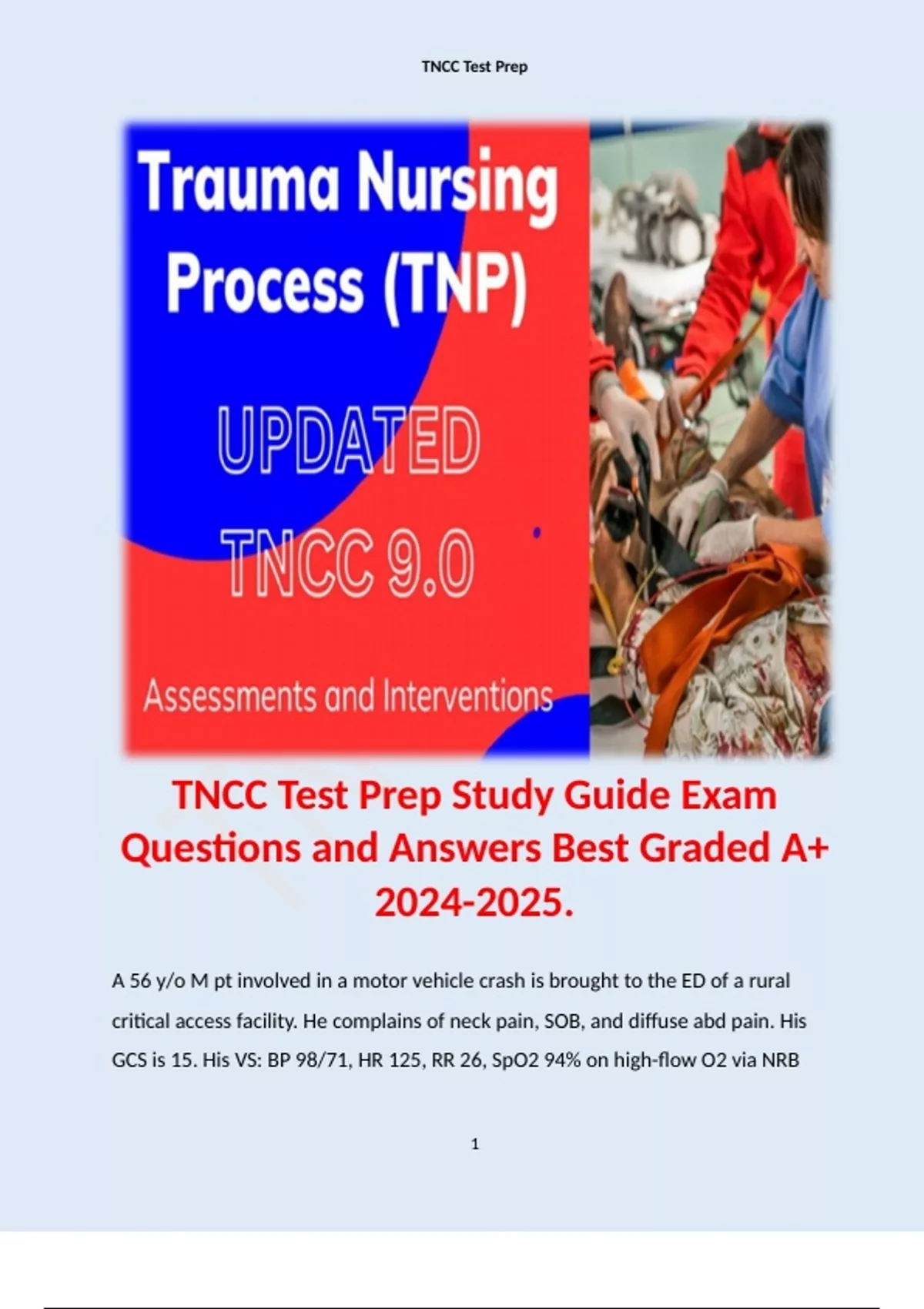 TNCC Test Prep Study Guide Exam Questions and Answers Best Graded A+ . Terms like: A 56 y/o M pt involved in a motor vehicle crash is brought to the ED of a rural critical access facility. He complains of neck pain, SOB, and diffuse abd pain. His GCS is 15. His VS: BP 98/71, HR 125, RR 26, SpO2 94% on high-flow O2 via NRB mask. Which of the following is the priority intervention for this patient? - Answer: Expedite transfer to the closest trauma center