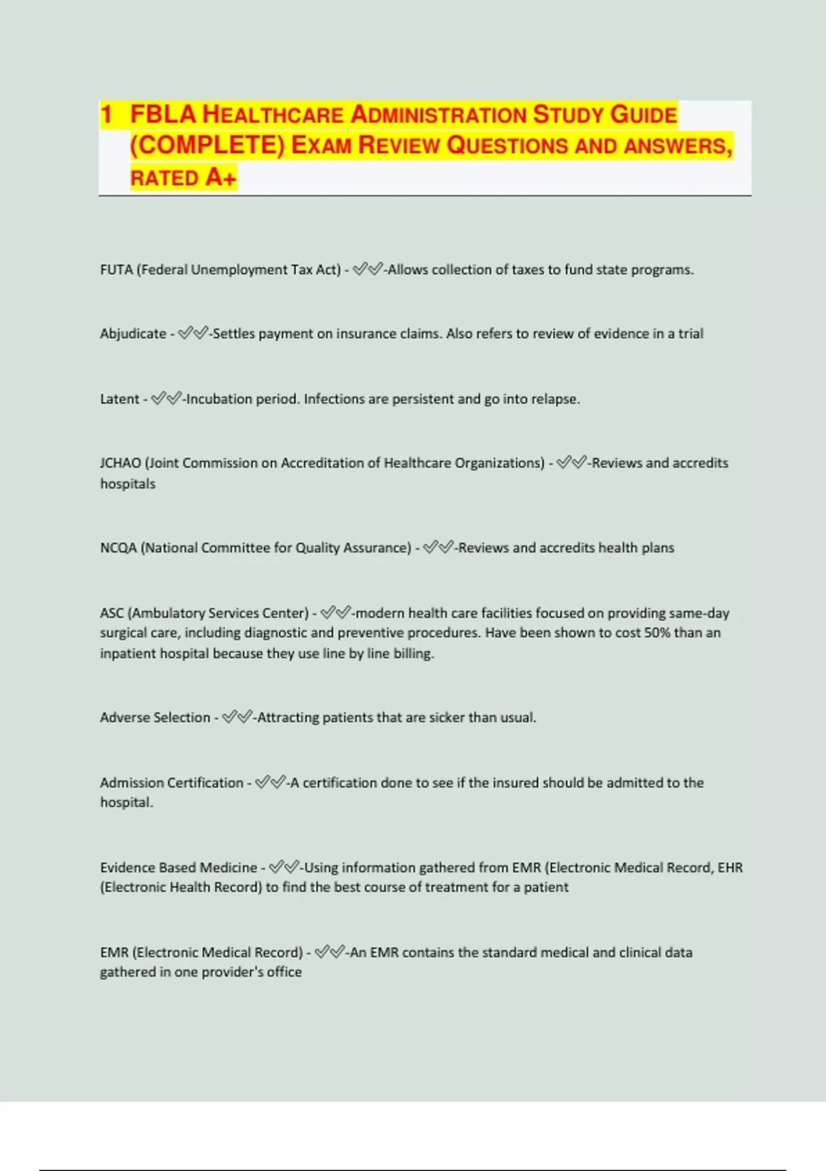 FBLA HEALTHCARE ADMINISTRATION STUDY GUIDE (COMPLETE) EXAM REVIEW QUESTIONS AND ANSWERS, RATED A+ FUTA (Federal Unemployment Tax Act) - -Allows collection of taxes to fund state programs. Abjudicate - -Settles payment on insurance claims. Also refers to review of evidence in a trial Latent - -Incubation period. Infections are persistent and go into relapse. JCHAO (Joint Commission on Accreditation of Healthcare Organizations) - -Reviews and accredits hospitals NCQA (National Committee for Quality Assurance) - -Reviews and accredits health plans ASC (Ambulatory Services Center) - -modern health care facilities focused on providing same-day surgical care, including diagnostic and preventive procedures. Have been shown to cost 50% than an inpatient hospital because they use line by line billing. Adverse Selection - -Attracting patients that are sicker than usual. Admission Certification - -A certification done to see if the insured should be admitted to the hospital. Evidence Based Medicine - -Using information gathered from EMR (Electronic Medical Record, EHR (Electronic Health Record) to find the best course of treatment for a patient EMR (Electronic Medical Record) - -An EMR contains the standard medical and clinical data gathered in one provider's office EHR (Electronic Health Record) - -goes beyond the data collected in the provider's office and includes a more comprehensive patient history collected from all medical providers that the patient has visited. HIPAA (Health Insurance Portability And Accountability Act of 1966) - -United States legislation that provides data privacy and security provisions for safeguarding medical information. National Labor Relations Act - -protect the rights of employees and employers, to encourage collective bargaining, and to curtail certain private sector labor and management practices, which can harm the general welfare of workers, businesses and the U.S. economy. HHS (Department of Health and Human Services) - -Also known as the Health Department, is a cabinet-level department of the U.S. federal government with the goal of protecting the health of all Americans and providing essential human services. NACHRI (National Association of Children's Hospitals and Related Institutions) - -A national organization composed of children's hospitals and related institutions whose programs are clinical, as opposed to social or custodial. A-,an- - -without, not, lack of Ante- - -before, in front of, or forwar