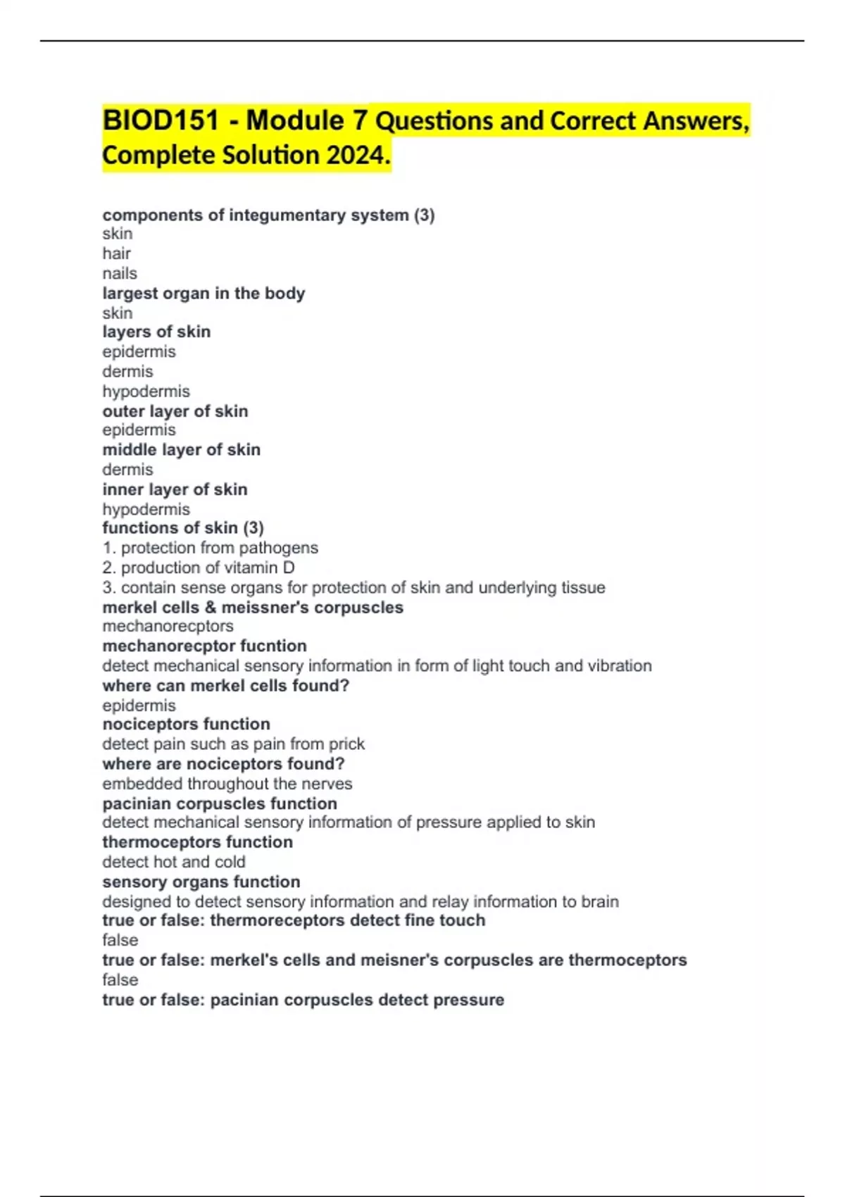 BIOD151 - Module 7 Questions and Correct Answers, Complete Solution 2024. components of integumentary system (3) skin hair nails largest organ in the body skin layers of skin epidermis dermis hypodermis outer layer of skin epidermis middle layer of skin dermis inner layer of skin hypodermis functions of skin (3) 1. protection from pathogens 2. production of vitamin D 3. contain sense organs for protection of skin and underlying tissue merkel cells & meissner's corpuscles mechanorecptors mechanorecptor fucntion detect mechanical sensory information in form of light touch and vibration where can merkel cells found? epidermis nociceptors function detect pain such as pain from prick where are nociceptors found? embedded throughout the nerves pacinian corpuscles function detect mechanical sensory information of pressure applied to skin thermoceptors function detect hot and cold sensory organs function designed to detect sensory information and relay information to brain true or false: thermoreceptors detect fine touch false true or false: merkel's cells and meisner's corpuscles are thermoceptors false true or false: pacinian corpuscles detect pressure true what does an exocrine gland contain and how do its contents reach the surface of the skin -contains secretions -released through duct into an epithelial surface or lining Sebaceous glands -oil glands -produce sebum sebum definition helps keep skin and hair from drying out and cracking and inhibits growth of harmful microbes Sweat glands are also called ______ sudoriferous glands sweat glands -Produce sweat in almost every part of the skin -perspiration thermoregulation helps body to regulate its temperature -perspiration is one method what type of cells make up the epithelium? stratified squamous stratified squamous epithelium layers of flat cells is the epidermis vascular or avascular? avascular receives nutrients from basement membrane 4 distinct layers of epidermis (superficial to deep) 1. stratum corneum 2. stratum granulosum 3. stratum spinosum 4. stratum basale how long do dead cells remain in the stratum corneum before they slough off? ~2 weeks true or false: cells of the stratum basale have a high rate of cell division true epidermal ridges -unique to each person and consistent throughout a person's lifetime -finger prints cells found in epidermis (5) 1. keratinocytes 2. langerhans cells 3. fibroblast cells 4. melanocytes 5. merkel cells keratinocytes