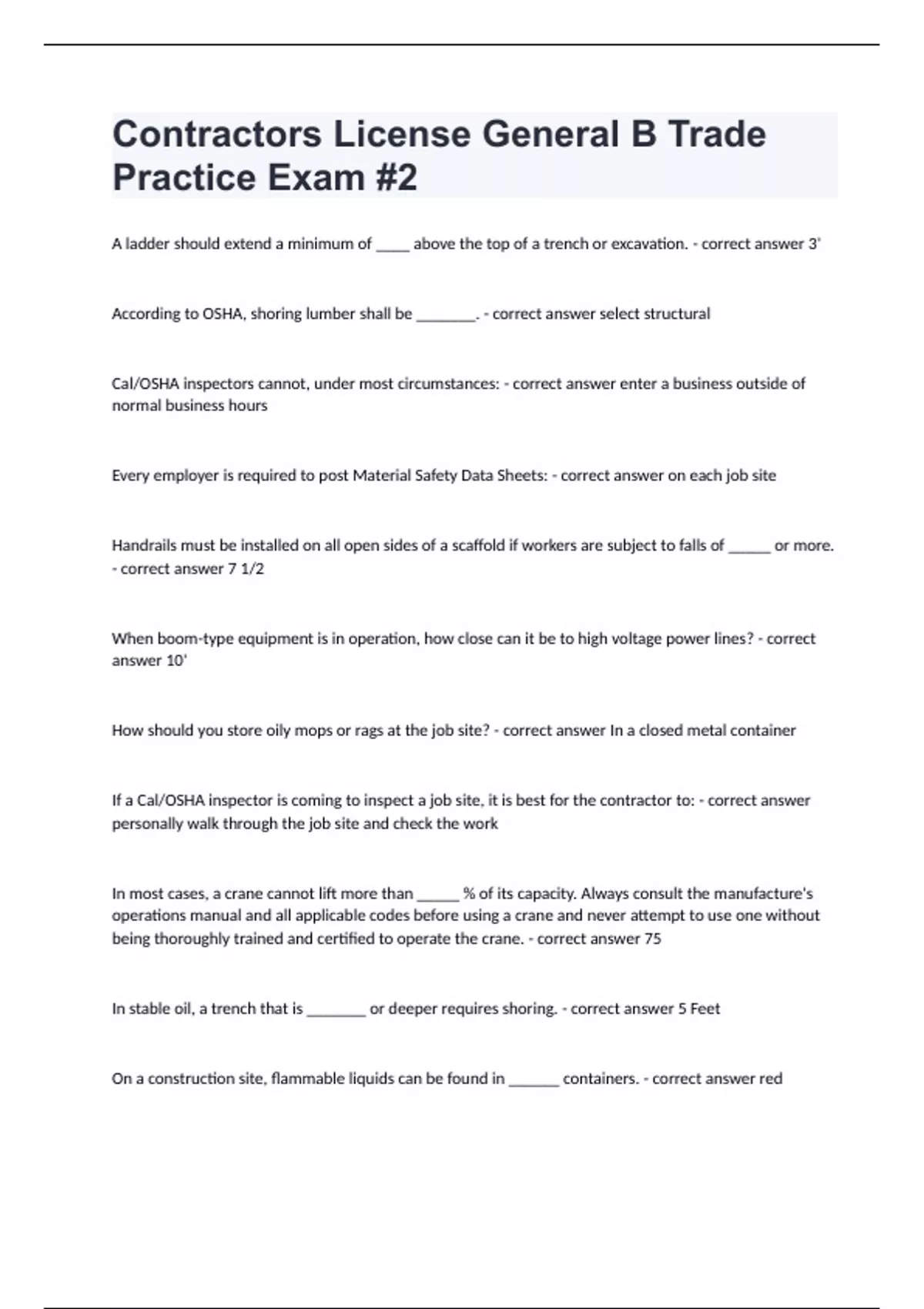 Contractors License General B Trade Practice Exam #2A ladder should extend a minimum of ____ above the top of a trench or excavation. - correct answer 3' According to OSHA, shoring lumber shall be _______. - correct answer select structural Cal/OSHA inspectors cannot, under most circumstances: - correct answer enter a business outside of normal business hours Every employer is required to post Material Safety Data Sheets: - correct answer on each job site Handrails must be installed on all open sides of a scaffold if workers are subject to falls of _____ or more. - correct answer 7 1/2 When boom-type equipment is in operation, how close can it be to high voltage power lines? - correct answer 10' How should you store oily mops or rags at the job site? - correct answer In a closed metal container If a Cal/OSHA inspector is coming to inspect a job site, it is best for the contractor to: - correct answer personally walk through the job site and check the work In most cases, a crane cannot lift more than _____ % of its capacity. Always consult the manufacture's operations manual and all applicable codes before using a crane and never attempt to use one without being thoroughly trained and certified to operate the crane. - correct answer 75 In stable oil, a trench that is _______ or deeper requires shoring. - correct answer 5 Feet On a construction site, flammable liquids can be found in ______ containers. - correct answer red