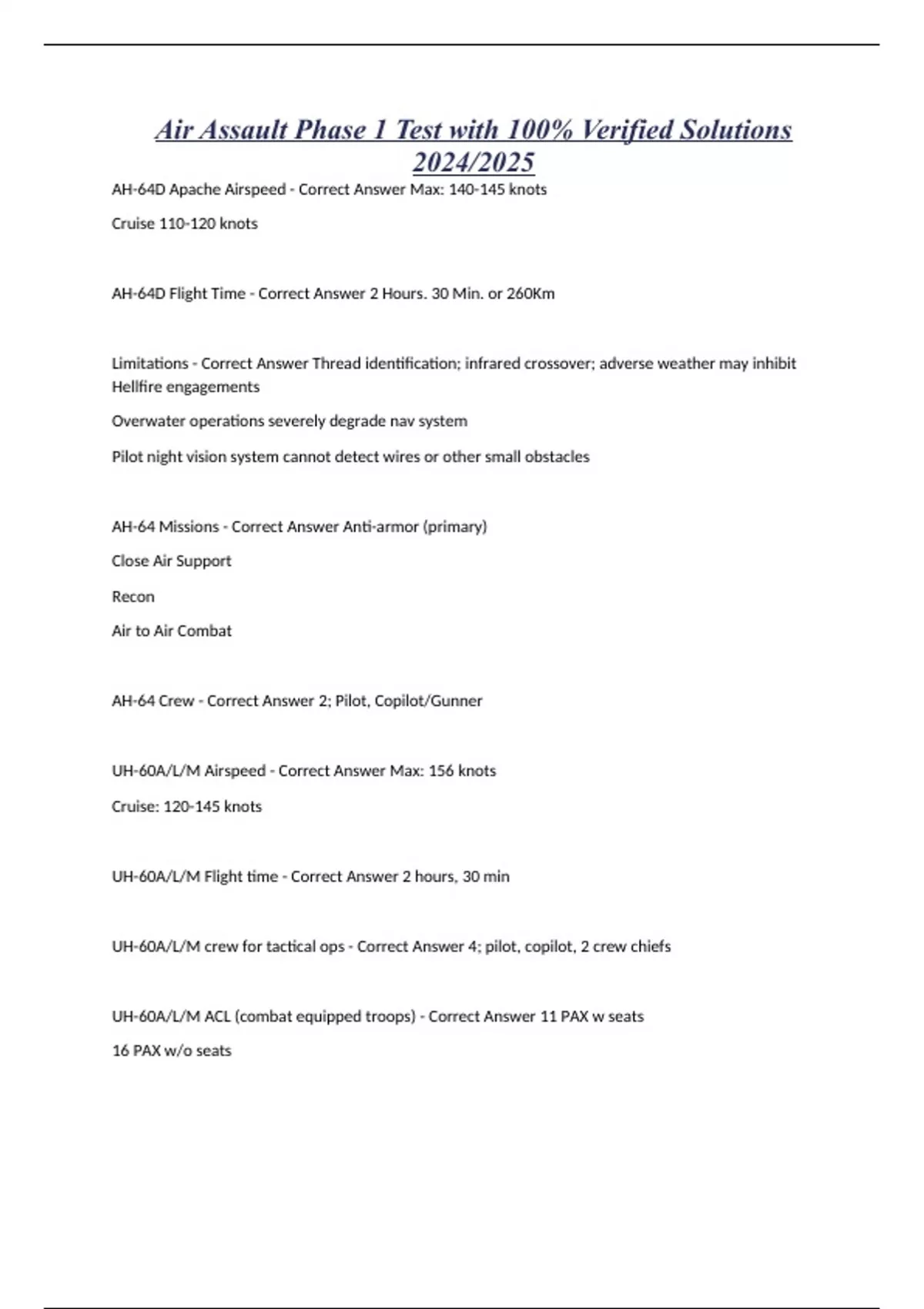 Air Assault Phase 1 Test with 100% Verified Solutions 2024/2025 AH-64D Apache Airspeed - Correct Answer Max: 140-145 knots Cruise 110-120 knots AH-64D Flight Time - Correct Answer 2 Hours. 30 Min. or 260Km Limitations - Correct Answer Thread identification; infrared crossover; adverse weather may inhibit Hellfire engagements Overwater operations severely degrade nav system Pilot night vision system cannot detect wires or other small obstacles AH-64 Missions - Correct Answer Anti-armor (primary) Close Air Support Recon Air to Air Combat AH-64 Crew - Correct Answer 2; Pilot, Copilot/Gunner UH-60A/L/M Airspeed - Correct Answer Max: 156 knots Cruise: 120-145 knots UH-60A/L/M Flight time - Correct Answer 2 hours, 30 min UH-60A/L/M crew for tactical ops - Correct Answer 4; pilot, copilot, 2 crew chiefs UH-60A/L/M ACL (combat equipped troops) - Correct Answer 11 PAX w seats 16 PAX w/o seats
