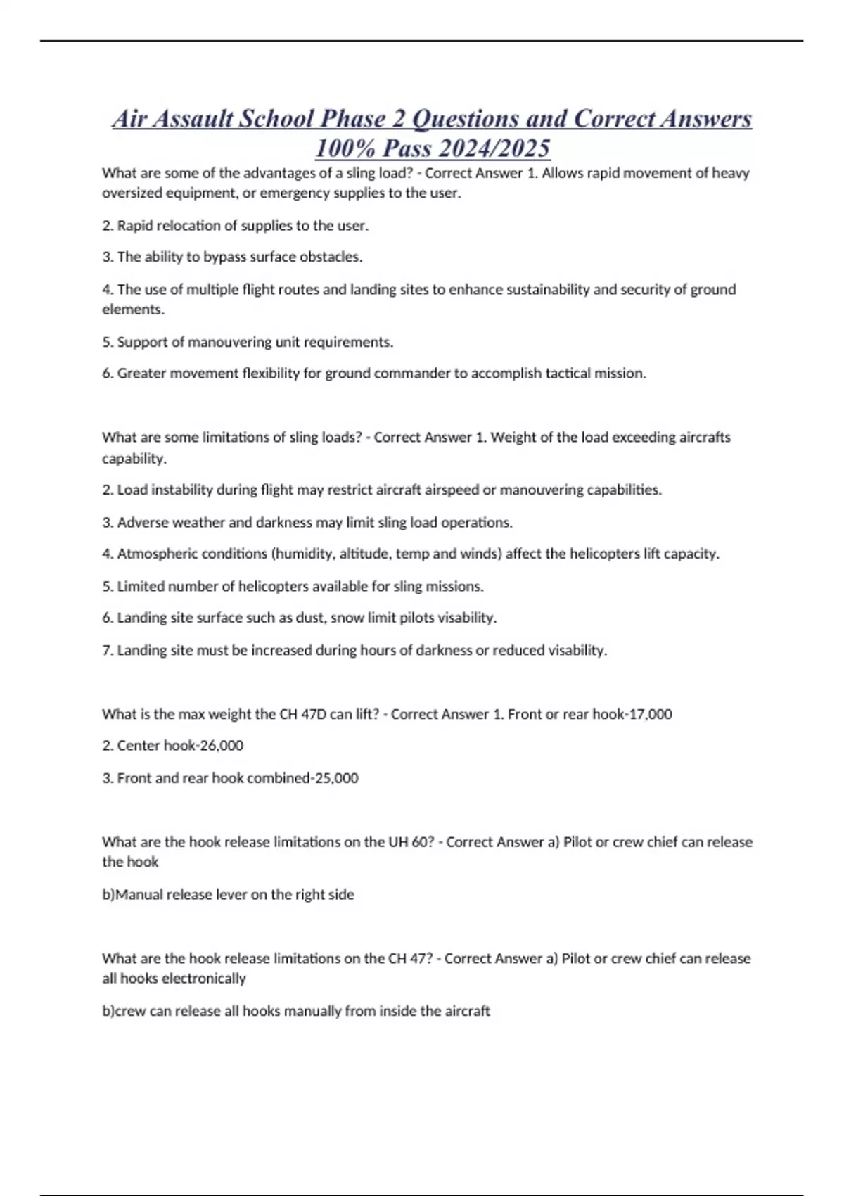 Air Assault School Phase 2 Questions and Correct Answers 100% Pass 2024/2025 What are some of the advantages of a sling load? - Correct Answer 1. Allows rapid movement of heavy oversized equipment, or emergency supplies to the user. 2. Rapid relocation of supplies to the user. 3. The ability to bypass surface obstacles. 4. The use of multiple flight routes and landing sites to enhance sustainability and security of ground elements. 5. Support of manouvering unit requirements. 6. Greater movement flexibility for ground commander to accomplish tactical mission. What are some limitations of sling loads? - Correct Answer 1. Weight of the load exceeding aircrafts capability. 2. Load instability during flight may restrict aircraft airspeed or manouvering capabilities. 3. Adverse weather and darkness may limit sling load operations. 4. Atmospheric conditions (humidity, altitude, temp and winds) affect the helicopters lift capacity. 5. Limited number of helicopters available for sling missions. 6. Landing site surface such as dust, snow limit pilots visability. 7. Landing site must be increased during hours of darkness or reduced visability. What is the max weight the CH 47D can lift? - Correct Answer 1. Front or rear hook-17,000 2. Center hook-26,000 3. Front and rear hook combined-25,000 What are the hook release limitations on the UH 60? - Correct Answer a) Pilot or crew chief can release the hook b)Manual release lever on the right side What are the hook release limitations on the CH 47? - Correct Answer a) Pilot or crew chief can release all hooks electronically b)crew can release all hooks manually from inside the aircraft