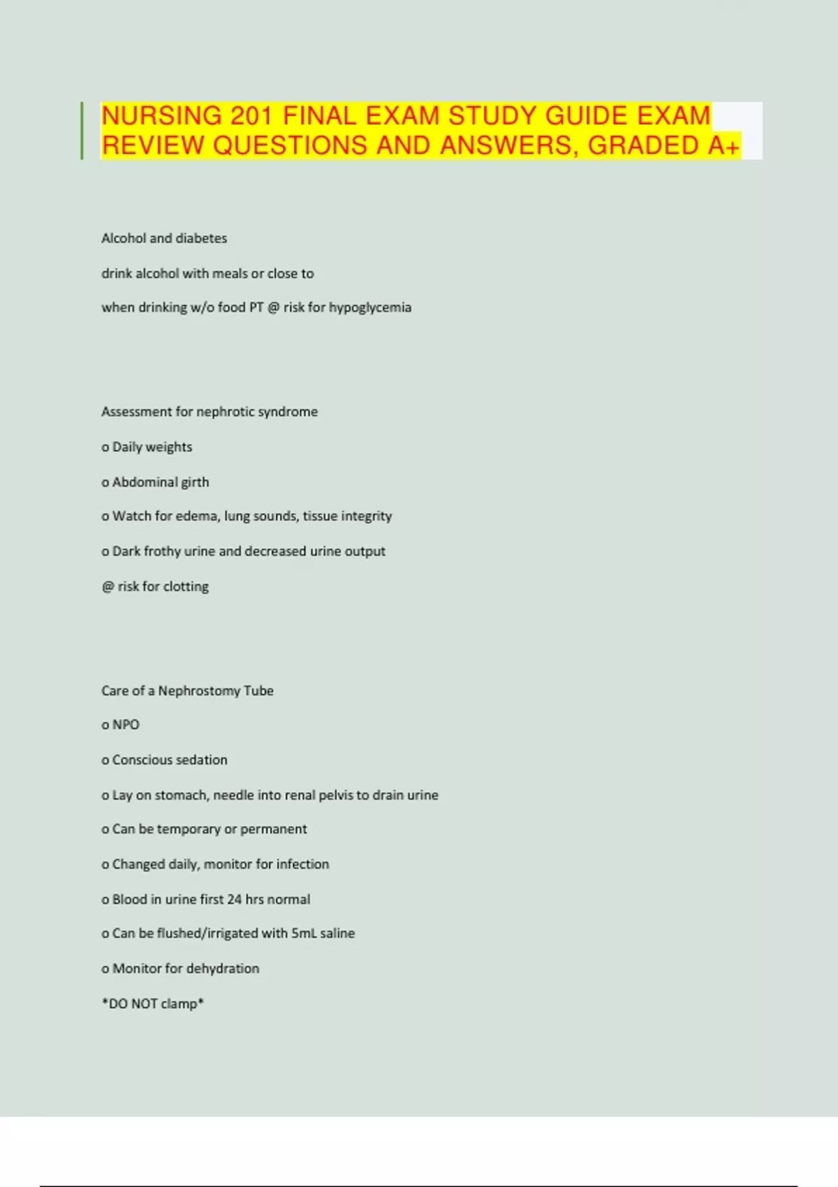 NURSING 201 FINAL EXAM STUDY GUIDE EXAM REVIEW QUESTIONS AND ANSWERS, GRADED A+ Alcohol and diabetes drink alcohol with meals or close to when drinking w/o food PT @ risk for hypoglycemia Assessment for nephrotic syndrome o Daily weights o Abdominal girth o Watch for edema, lung sounds, tissue integrity o Dark frothy urine and decreased urine output @ risk for clotting Care of a Nephrostomy Tube o NPO o Conscious sedation o Lay on stomach, needle into renal pelvis to drain urine o Can be temporary or permanent o Changed daily, monitor for infection o Blood in urine first 24 hrs normal o Can be flushed/irrigated with 5mL saline o Monitor for dehydration *DO NOT clamp* comfort measures with cystitis o Sitz bath o Peri care, Provide intermittent heat to abdomen, Change brief frequently o Antibiotics (for chronic UTI), Macrobid, peridium, azo (change urine orange) o Increase fluid to 3L day Diabetes mellitus type 1 o Insulin Dependent o Peak incidence o Weight loss, fatigue, frequent infections o Polyuria, Polydipsia, Polyphagia o Rapid onset o Family tendencies Typically found in younger/adolescents ** complication - DKA ** Diabetes Mellitus type 2 o Obese, sedentary lifestyle o Average age of 50 o Hx ↑ BP o Fatigue and ↓ energy o Recurrent infection o Polydipsia, Polyuria o Fasting blood glucose (FSB) >126 o Started on oral meds Metformin