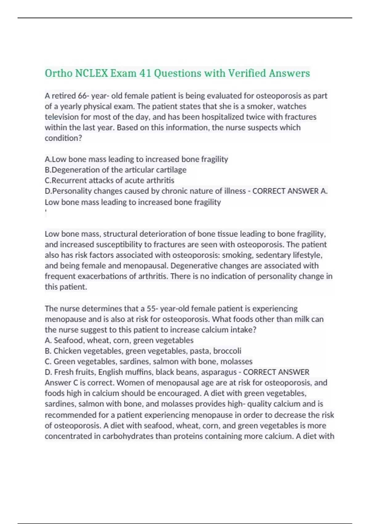 Ortho NCLEX Exam 41 Questions with Verified Answers A retired 66- year- old female patient is being evaluated for osteoporosis as part of a yearly physical exam. The patient states that she is a smoker, watches television for most of the day, and has been hospitalized twice with fractures within the last year. Based on this information, the nurse suspects which condition? A.Low bone mass leading to increased bone fragility B.Degeneration of the articular cartilage C.Recurrent attacks of acute arthritis D.Personality changes caused by chronic nature of illness - CORRECT ANSWER A. Low bone mass leading to increased bone fragility ' Low bone mass, structural deterioration of bone tissue leading to bone fragility, and increased susceptibility to fractures are seen with osteoporosis. The patient also has risk factors associated with osteoporosis: smoking, sedentary lifestyle, and being female and menopausal. Degenerative changes are associated with frequent exacerbations of arthritis. There is no indication of personality change in this patient. The nurse determines that a 55- year-old female patient is experiencing menopause and is also at risk for osteoporosis. What foods other than milk can the nurse suggest to this patient to increase calcium intake? A. Seafood, wheat, corn, green vegetables B. Chicken vegetables, green vegetables, pasta, broccoli C. Green vegetables, sardines, salmon with bone, molasses D. Fresh fruits, English muffins, black beans, asparagus - CORRECT ANSWER Answer C is correct. Women of menopausal age are at risk for osteoporosis, and foods high in calcium should be encouraged. A diet with green vegetables, sardines, salmon with bone, and molasses provides high- quality calcium and is recommended for a patient experiencing menopause in order to decrease the risk of osteoporosis. A diet with seafood, wheat, corn, and green vegetables is more concentrated in carbohydrates than proteins containing more calcium. A diet with chicken, green vegetables, sardines, and broccoli contains some calcium but is lower than the other option. Foods such as fresh fruits, English muffins, black beans, and asparagus are inadequate in calcium. A patient with osteoporosis has been advised to increase the amount of calcium in her diet. Which food provides the most calcium? An 8- oz glass of milk An ounce of cheddar cheese A half cup of raw broccoli A 4- ounce salmon croquette - CORRECT ANSWER Answer A is correct. An 8-ounce glass of milk contains 290mg of calcium. Answers B, C, and D contain lesser amounts; therefore, they are incorrect. (Note: An ounce of cheddar cheese contains 205 mg of calcium; half a cup of raw broccoli contains 175mg of calcium; and 4 ounces of salmon croquette contains 165 mg of calcium). Which of the following instructions should be included for the patient taking calcium supplements? A.The patient should take her calcium with meals B.The patient should take all her daily calcium supplements at one time C.The patient should take her calcium supplement after meals to prevent stomach upset D.The patient can use calcium- based antacids for supplement. - CORRECT ANSWER Rationale: Answer D is correct. Many people prefer to supplement their calcium intake with calcium- based antacids. If calcium supplements are used, they should be administered 30 minutes before meals to maximize absorption, so answer A is wrong. Calcium absorption is better if it is administered throughout the day rather than in a single dose, making answer B wrong. Calcium supplements do not cause stomach upset, so answer C is wrong. Alendronate (Fosamax) is ordered for a patient with osteoporosis. Which information should the nurse teach the patient about the medication? A. Acts as a selective estrogen receptor modulator B. Reduces risk of invasive breast cancer C. May be obtained as a nasal spray D. Inhibits bone resorption - CORRECT ANSWER Alendronate (Fosamax), a bisphosphonate, is a potent inhibitor of bone resorption that preserves bone mass and increases bone density. Raloxifene (Evista) is an example of a selective estrogen receptor modulator that is used to treat osteoporosis, and which also reduces the risk of invasive breast cancer. Calcitonin (Miacalcin) is dispensed as a nasal spray. The nurse is caring for a patient with osteoporosis who is being discharged on alendronate (Fosamax). Which statement would indicate effective teaching? A. "I should take the medication immediately before bed" B. "I should remain in an upright position for 30 minutes after taking the medication" C. "The medication is more effective if I take it with milk or dairy products" D. If I skip a dose, I can take two tablets the next time" - CORRECT ANSWER Answer: B- Rationale should remain upright for 30 mins. How long does a patient taking bisphosphonates need to stay upright after administration? A. 10 minutes B. 20 minutes C. 30 minutes D. 120 minutes - CORRECT ANSWER 30 minutes Bisphosphonates are administered on arising in the morning with a full glass of water on an empty stomach, and the patient must stay upright for 30 to 60 minutes. When caring for a client with hypocalcemia, the nurse should assess for: A. A decreased level of consciousness B. Tetany C. Bradycardia D. Respiratory Depression - CORRECT ANSWER Answer B is correct. The most common complication of hypocalcemia is overstimulation of the nerves and muscles. Tetany, which can progress to convulsions, indicated that the patient's condition is worsening. Answer A is incorrect because a decreased level of consciousness is not associated with hypocalcemia. Tachycardia, not bradycardia, is associated with hypocalcemia, making answer C incorrect. Answer D is incorrect because respiratory depression is not directly related to hypocalcemia. A patient has been diagnosised with osteomalacia. What symptoms does the nurse recognize that correlate with the diagnosis? A. Bone fractures and kyphosis B. Bone pain and tenderness C. Muscle Weakness and spasms D. Soften