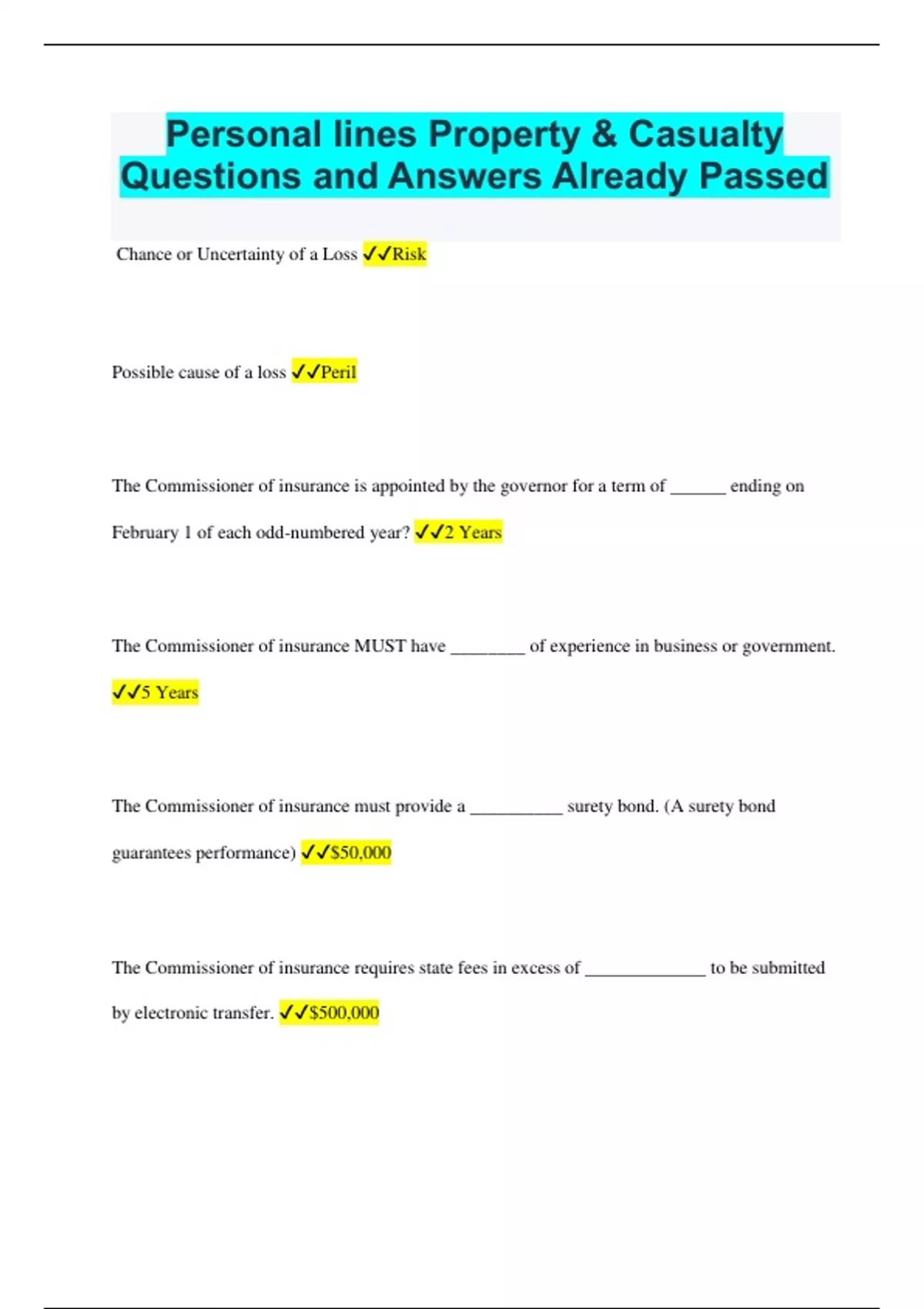 Personal lines Property & Casualty Questions and Answers Already Passed