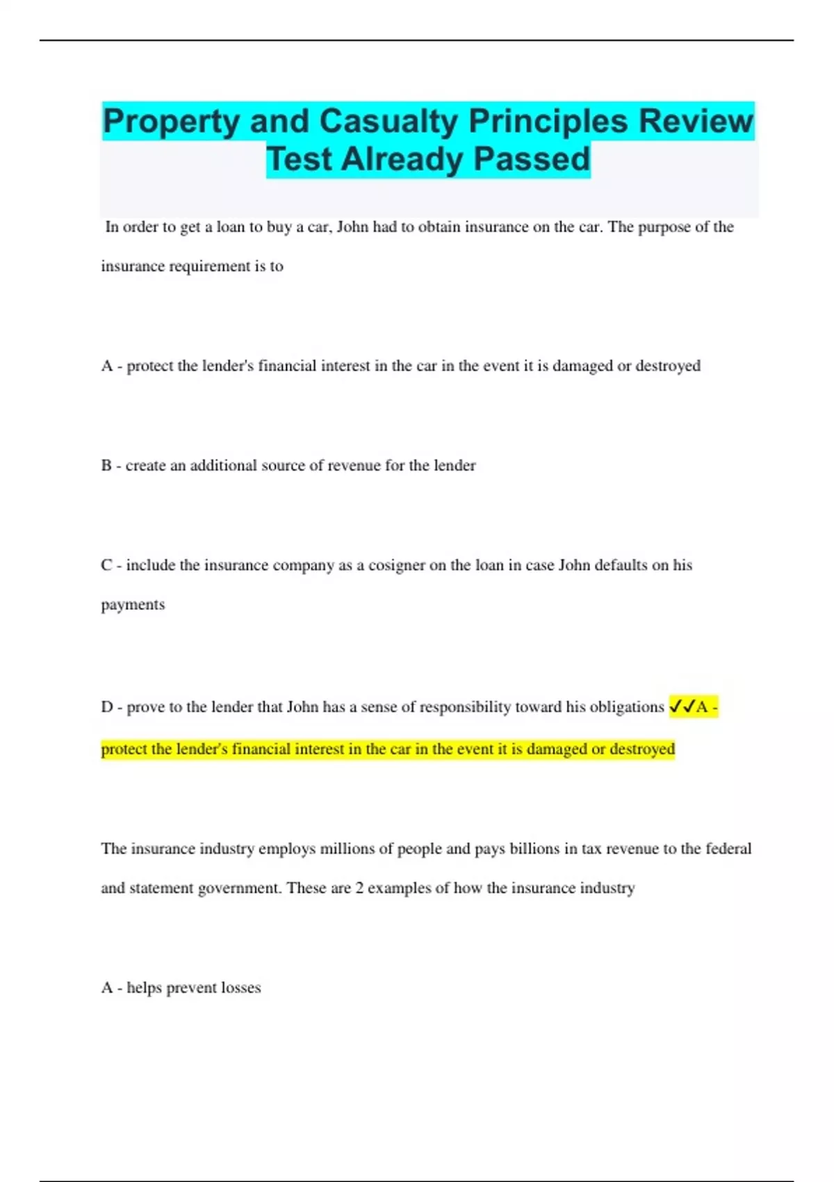 Property and Casualty Principles Review Test Already Passed In order to get a loan to buy a car, John had to obtain insurance on the car. The purpose of the insurance requirement is to A - protect the lender's financial interest in the car in the event it is damaged or destroyed B - create an additional source of revenue for the lender C - include the insurance company as a cosigner on the loan in case John defaults on his payments D - prove to the lender that John has a sense of responsibility toward his obligations A - protect the lender's financial interest in the car in the event it is damaged or destroyed The insurance industry employs millions of people and pays billions in tax revenue to the federal and statement government. These are 2 examples of how the insurance industry A - helps prevent losses B - Contributes to the nation's economic well-being C - Provides financial security for insureds D - Restores economic stability after catastrophic losses B - Contributes to the nation's economic well-being You ask an insurance producer, "How much is the premium for this policy?" You are interested in knowing how much you would A - pay the insurer for the insurance policy B - have to pay in additional charges to obtain an excluded coverage C - Receive as a refund if you decide to cancel the policy if you no longer require the coverage D - collect for any loss you might sustain A - pay the insurer for the insurance policy George wants insurance to indemnify himself for the gradual wearing out of the roof on his house. Which answer choice below best completes the reason that such a loss would be difficult to insure? A - a risk to a sufficient number of people B - calculable C - catastrophic D - accidental in nature D - accidental in nature Danny decides that he would like to get a piece of the action by buying part of an insurance policy covering the United Nations building in New York. He figures that if the building burns, he would collect some money. Of course, this is an impossible plan because A - the principle of subrogation prevents the payment of money to those not directly involved with the loss B - Danny has no insurable interest in the United Nations building C - insurance is primarily based on the theory of substituting certainty for uncertainty D - the United Nations building is 1 of the world's truly fireproof buildings. B - Danny has no insurable interest in the United Nations building The principle of indemnity is expressed in which of the following sentences? A - A loss must be large enough to create a financial burden for the insured in order for it to be insurable B - The insured should be restored financially to approximately the same position she was in prior to the loss. C - The insured should always receive less