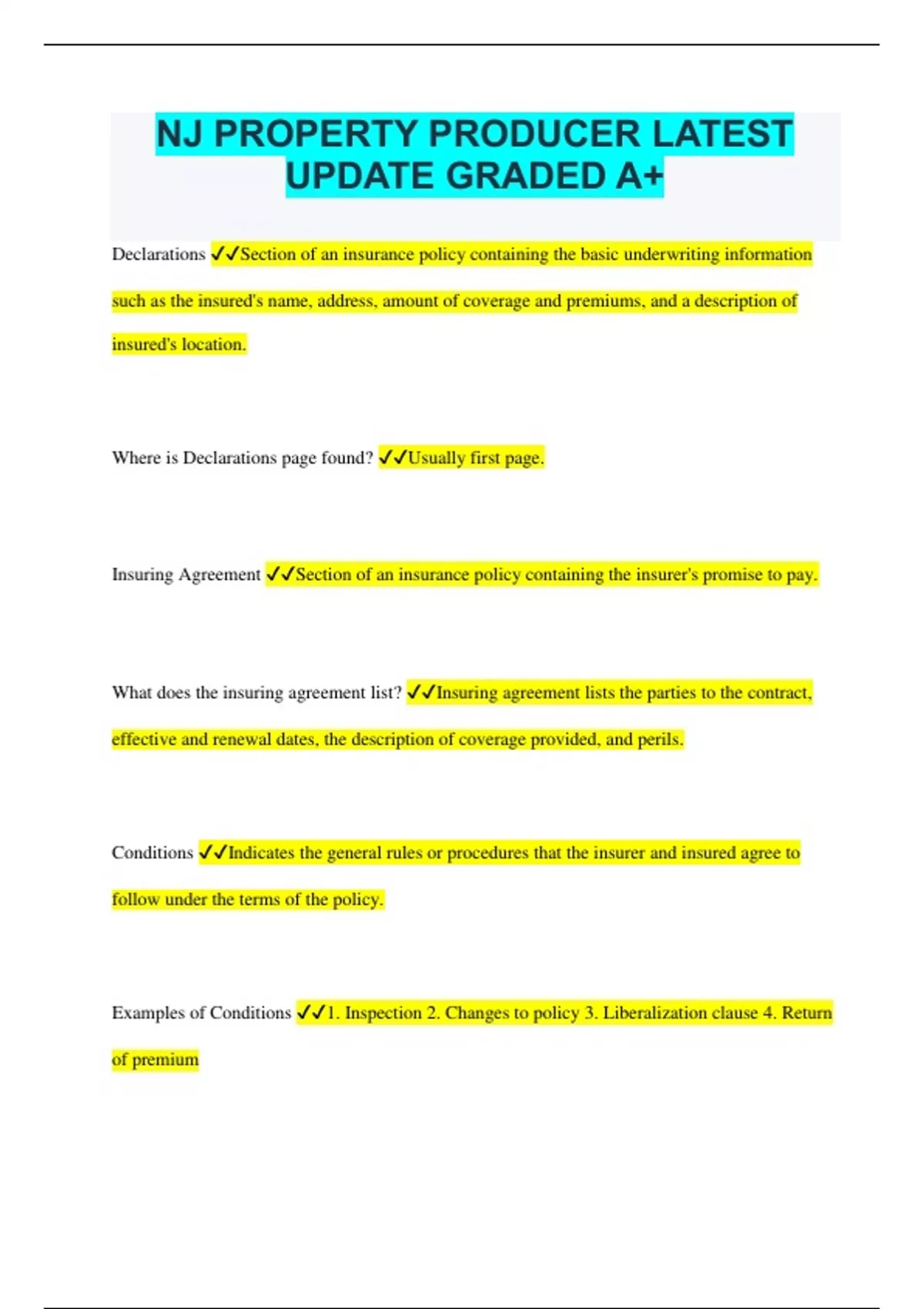 NJ PROPERTY PRODUCER LATEST UPDATE GRADED A+ Declarations Section of an insurance policy containing the basic underwriting information such as the insured's name, address, amount of coverage and premiums, and a description of insured's location. Where is Declarations page found? Usually first page. Insuring Agreement Section of an insurance policy containing the insurer's promise to pay. What does the insuring agreement list? Insuring agreement lists the parties to the contract, effective and renewal dates, the description of coverage provided, and perils. Conditions Indicates the general rules or procedures that the insurer and insured agree to follow under the terms of the policy. Examples of Conditions 1. Inspection 2. Changes to policy 3. Liberalization clause 4. Return of premium Inspection (Condition) As needed by insurer. Insurance company reserves the right to inspect or examine the insured's location or books to determine the exact exposure for underwriting and rating purposes. Changes to policy (Condition) Must be made by insurer and MUST be in writing. Liberalization Clause (Condition) Ensures if insurer introduces an improved "free coverage", the insured will get the benefit of the new coverage immediately and will not have to wait for policy renewal. (Similar to adjustment policies) Return of premium (Condition) Dictates the method that will be used to calculate the return premium when the policy is cancelled before the expiration date. Exclusions Section of insurance policy that details what perils are NOT insured against and what persons are NOT insured. Exclusion Examples from Property Policy Earth movement and water damage. Insured Person or persons named in an insurance policy that is protected under the contract, to whom the insurer reimburses losses, pays benefits or provides services. Duties of the Insured 1. Protect the damaged property from further loss. 2. Prepare an inventory of damaged property. 3. Cooperate with the insurer in settling loss. 4. Notify policy in case of theft loss. 5. Submit signed proof of loss within allotted time. Obligations of the Insurance Company In return for premium, must be fair in underwriting and must pay covered losses. Mortgage Clause Attached to a policy to protect the interest of the mortgagee in the mortgaged property. The loss reimbursement will be paid to the mortgagee as interest appears. Mortgagee's rights of recovery will not be defeated