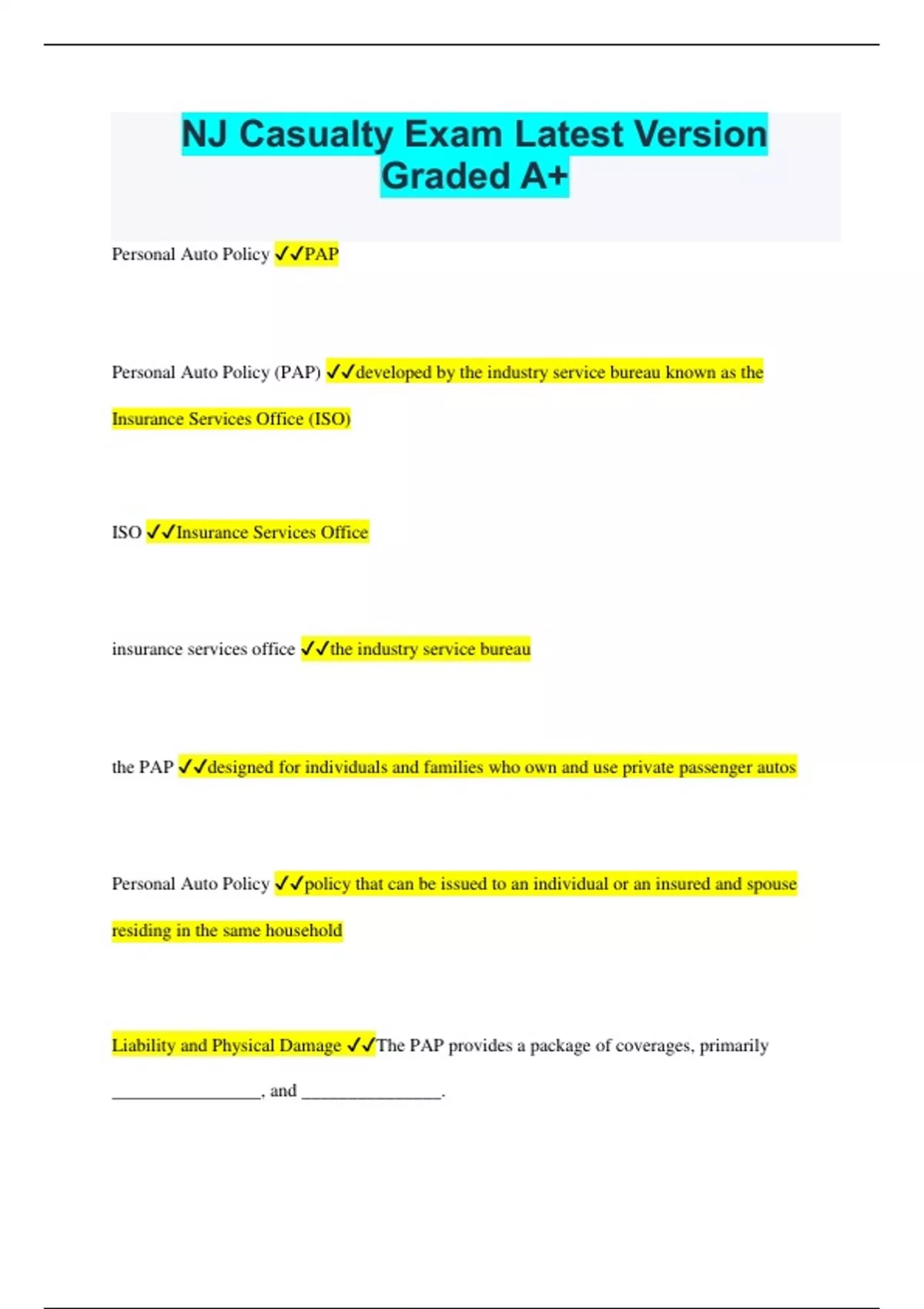 NJ Casualty Exam Latest Version Graded A+ Personal Auto Policy PAP Personal Auto Policy (PAP) developed by the industry service bureau known as the Insurance Services Office (ISO) ISO Insurance Services Office insurance services office the industry service bureau the PAP designed for individuals and families who own and use private passenger autos Personal Auto Policy policy that can be issued to an individual or an insured and spouse residing in the same household Liability and Physical Damage The PAP provides a package of coverages, primarily ________________, and _______________. Liability (third person) provides coverage in the event an insured injures someone else or damages another person's property Physical Damage coverage in the event that his/her own auto is damaged in an accident or by another peril such as fire or theft Declarations ISO PAP, Endorsements The ISO PAP consists of