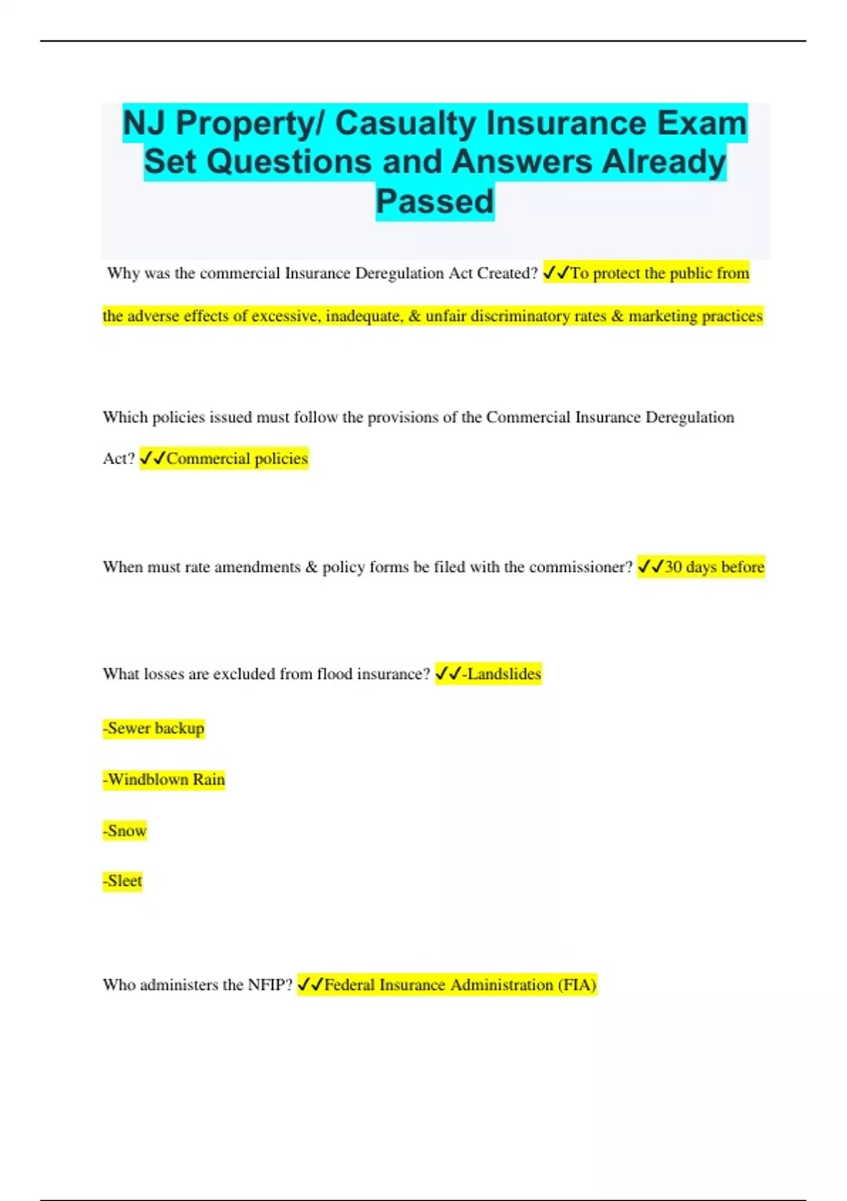 NJ Property/ Casualty Insurance Exam Set Questions and Answers Already Passed Why was the commercial Insurance Deregulation Act Created? To protect the public from the adverse effects of excessive, inadequate, & unfair discriminatory rates & marketing practices Which policies issued must follow the provisions of the Commercial Insurance Deregulation Act? Commercial policies When must rate amendments & policy forms be filed with the commissioner? 30 days before What losses are excluded from flood insurance? -Landslides -Sewer backup -Windblown Rain -Snow -Sleet Who administers the NFIP? Federal Insurance Administration (FIA) What does the NFIP stand for? National Flood Insurance Program Why was the National Flood insurance Program constructed? to fill in gaps of flood coverage by the private sector What are the 3 NFIP requirements for coverage? -community land management & flood control programs must reduce flood losses in the future -Flood insurance required in specific flood prone areas as a condition for receiving loans through/ backed by the federal government -Property owners that fail to purchase flood insurance within 1 year after it is available will not be eligible for full disaster relief funding. It will be reduced by an amount of insurance that could have been purchased What is the NFIP max coverage for a single family? Building $250K, Contents $100K What is the NFIP max coverage for other residential? Building $250K, Contents $100K What is the NFIP max coverage for small business? Building $500K, Contents $500K What is the NFIP max coverage for Other Non-Residential? Building $500k, Contents $500K What is the NFIP subsidized rate for a single family? Building $35K, Contents $10K What is the NFIP subsidized rate for Other Residential? Building $100K , Contents $100K What is the NFIP subsidized rate for small businesses? Building $100K, Contents $100K What is the NFIP subsidized rate for other non-residential? Building $100K, Contents $100K What is the wait period before flood insurance can be effective? 30 days, no binders issued What are the exceptions to the 30 day NFIP wait period? -1st 30 days after coverage, community enters standard or emergency program, coverage will begin at 12:01 am the date after application and premium were mailed -When an existing policy was assigned to a property purchaser -At 12:01 am on the 5th day after an endorsement