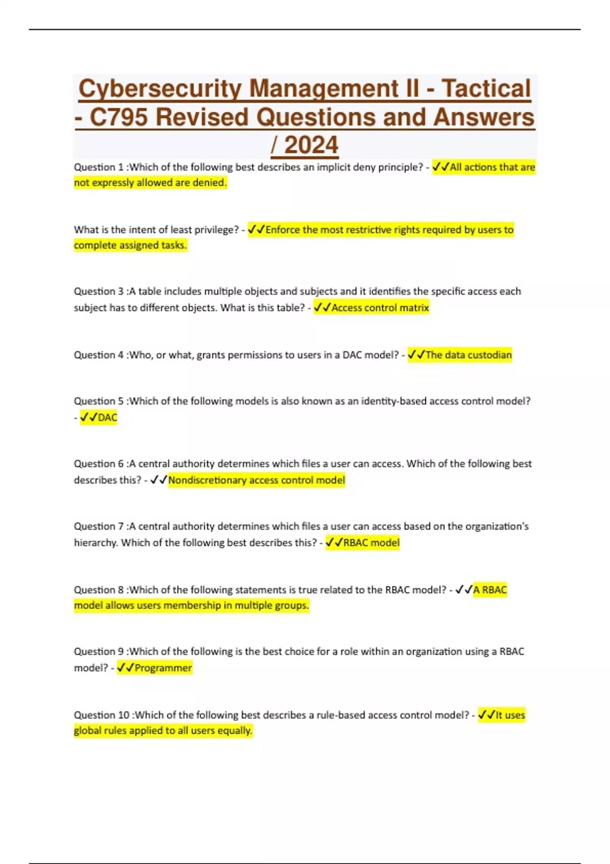 Question 1 :Which of the following best describes an implicit deny principle? - All actions that are not expressly allowed are denied. What is the intent of least privilege? - Enforce the most restrictive rights required by users to complete assigned tasks. Question 3 :A table includes multiple objects and subjects and it identifies the specific access each subject has to different objects. What is this table? - Access control matrix Question 4 :Who, or what, grants permissions to users in a DAC model? - The data custodian Question 5 :Which of the following models is also known as an identity-based access control model? - DAC Question 6 :A central authority determines which files a user can access. Which of the following best describes this? - Nondiscretionary access control model Question 7 :A central authority determines which files a user can access based on the organization's hierarchy. Which of the following best describes t