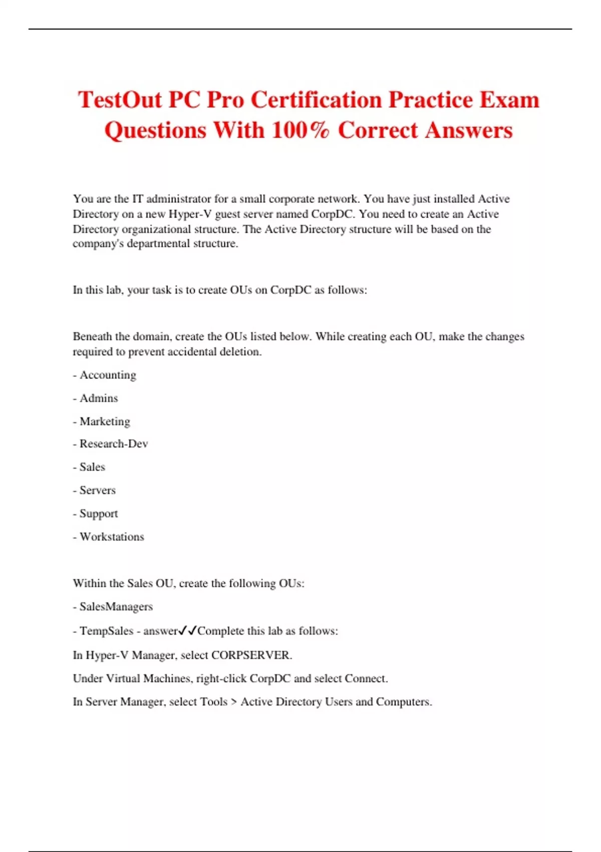 TestOut PC Pro Certification Practice Exam Questions With 100% Correct Answers You are the IT administrator for a small corporate network. You have just installed Active Directory on a new Hyper-V guest server named CorpDC. You need to create an Active Directory organizational structure. The Active Directory structure will be based on the company's departmental structure. In this lab, your task is to create OUs on CorpDC as follows: Beneath the domain, create the OUs listed below. While creating each OU, make the changes required to prevent accidental deletion. - Accounting - Admins - Marketing - Research-Dev - Sales - Servers - Support - Workstations Within the Sales OU, create the following OUs: - SalesManagers - TempSales - answerComplete this lab as follows: In Hyper-V Manager, select CORPSERVER. Under Virtual Machines, right-click CorpDC and select Connect. In Server Manager, select Tools > Active Directory Users and Computers. In the left pane, right-click CorpN. Select New > Organizational Unit. In the Name field, enter the OU name. Make sure Protect container from accidental deletion is selected. Click OK. Repeat steps 4-8 to create additional OUs. Create OUs in the Sales container as follows:In the left pane, right-click Sales.Select New > Organizational Unit.In the Name field, enter the OU name.Make sure Protect container from accidental deletion is selected.Click OK.Repeat step 10 to create additional OUs. You are the IT administrator for a small corporate network. You are configuring Windows Update on the Office2 workstation in Office 2. In this lab, your task is to complete the following: - Set the active hours of the workstation to 6:00 a.m. to 11:00 p.m. - Configure Windows Update to install updates semi-annually. - Allow other Microsoft products to update when I update Windows. - Defer the update to 90 days. - Set security improvements to 0 days. - Set Pause Updates to Off. - answerComplete this lab as follows: Right-click Start and select Settings. Maximize the window for easier viewing. Select Update & security. Under Update Settings, select Change active hours. Set the Start time to 6:00 a.m. Select the check mark. Set the End time to 11:00 p.m. Select the check mark. Select Save. Select Advanced options. Select Give me updates for other Microsoft products when I update Windows. From the Choose when updates are installed drop-down list, select Semi-Annual Channel. From the deferred update drop-down list, select 90. From the deferred security improvements drop-down list, select 0. Set Pause Updates to Off. You work at a computer repair store. You're building a computer. You just installed four 8-GB memory modules for a total of 32 GB of memory (32,768 MB). When you try to boot the computer, the screen is blank, and the computer beeps several times. In this lab, your task is to diagnose and correct the problem as follows: Identify which memory modules are not working. Use the memory tester to identify working and non-working modules. Install 32 GB of working modules. Use spares from the Shelf if necessary. Place any non-working memory modules on the Shelf. After you install the memory, boot into the BIOS setup and verify that the correct amount of memory is detected. - answerTest the memory modules in the computer as follows: Above the computer, select Motherboard to switch to the motherboard view of the computer. On the Shelf, expand PC Tools. Drag the Memory Tester from the Shelf to the Workspace. Drag a memory module from the computer to the correct slot on the memory tester. Select Test. If the memory tester indicates BAD or ERROR, the module is bad. Drag the module to the Shelf. If the memory tester indicates OK, the module is good. Return the module to the computer. Repeat steps 1d-1e for all memory modules in the computer. Test and install the memory modules on the Shelf as follows: On the Shelf, expand Memory Modules. Drag a memory module from the Shelf to the correct slot on the memory tester. Select Test. If the memory tester indicates BAD or ERROR, the module is bad; return the module to the Shelf. If the memory tester indicates OK, the module is good; drag the module to the computer. Repeat steps 2b-2c until all memory slots in the computer are filled with good modules. Boot into the BIOS and verify that all installed modules are recognized by the BIOS as follows: Above the computer, select Front to switch to the front view of the computer. On the computer, select the power button on the front of the computer. When the BIOS loading window appears, press F2 to enter the BIOS. You are the IT administrator for a small corporate network. You need to configure the laptop computer in the Lobby to use the corporate proxy server. The proxy server is used to control access to the internet. In this lab, your task is to configure the proxy server settings as follows: Address: Port: 9000 - answerFrom the taskbar, open Internet Explorer. To the right of the URL field, select Tools. Select Internet options. Select the Connections tab. Select LAN settings. Enable Use a proxy server for your LAN. In the Address field, enter . In the Port field, enter 9000. Click OK. Click OK. You are the IT administrator for a small corporate network. To accommodate specific network communication needs for an upcoming project, you need to upgrade the network connection's speed for the workstation in the Support Office.