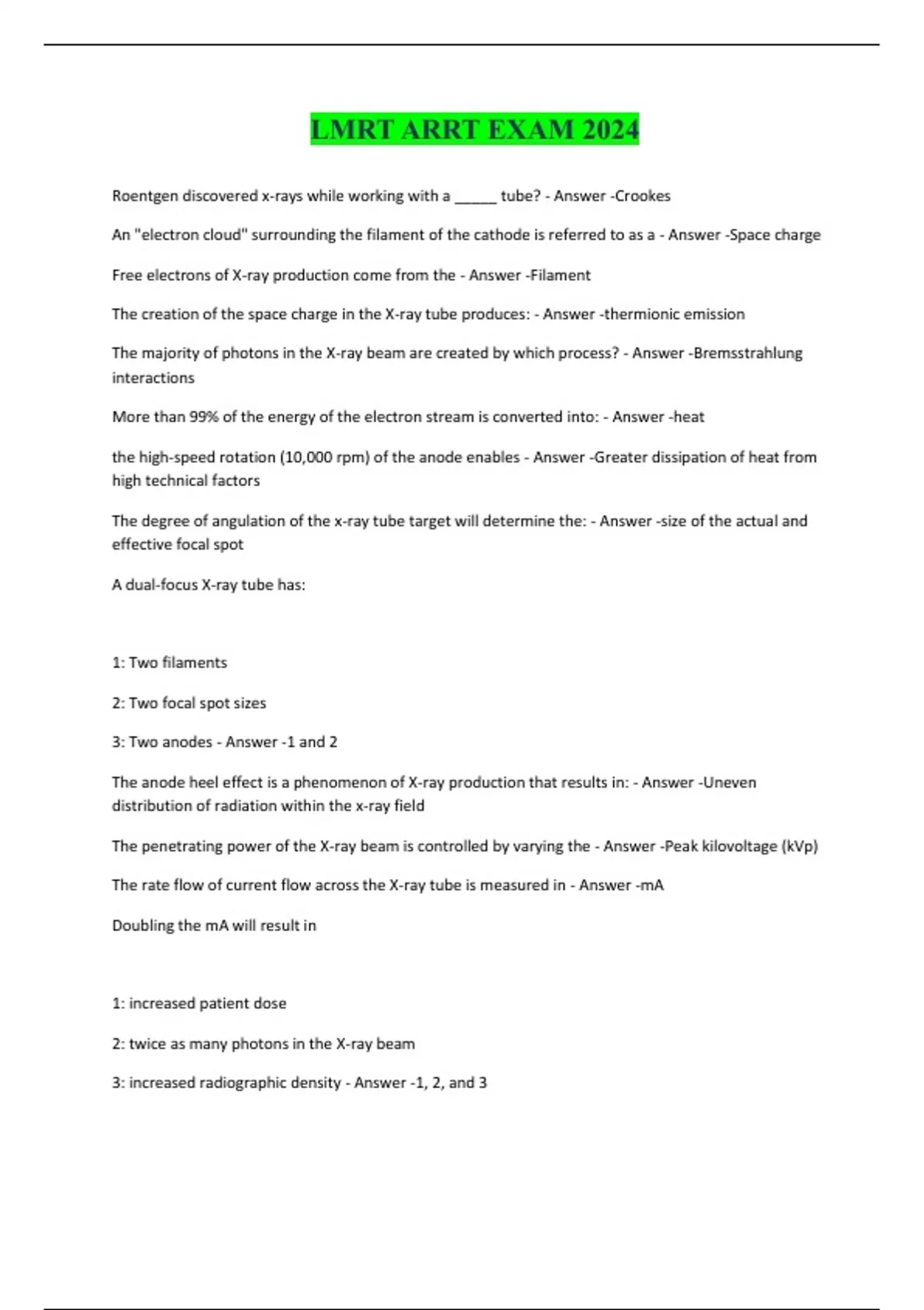 LMRT ARRT EXAM 2024 Roentgen discovered x-rays while working with a _____ tube? - Answer -Crookes An "electron cloud" surrounding the filament of the cathode is referred to as a - Answer -Space charge Free electrons of X-ray production come from the - Answer -Filament The creation of the space charge in the X-ray tube produces: - Answer -thermionic emission The majority of photons in the X-ray beam are created by which process? - Answer -Bremsstrahlung interactions More than 99% of the energy of the electron stream is converted into: - Answer -heat the high-speed rotation (10,000 rpm) of the anode enables - Answer -Greater dissipation of heat from high technical factors The degree of angulation of the x-ray tube target will determine the: - Answer -size of the actual and effective focal spot A dual-focus X-ray tube has: 1: Two filaments 2: Two focal spot sizes 3: Two anodes - Answer -1 and 2 The anode heel effect is a phenomenon of X-ray production that results in: - Answer -Uneven distribution of radiation within the x-ray field The penetrating power of the X-ray beam is controlled by varying the - Answer -Peak kilovoltage (kVp) The rate flow of current flow across the X-ray tube is measured in - Answer -mA Doubling the mA will result in
