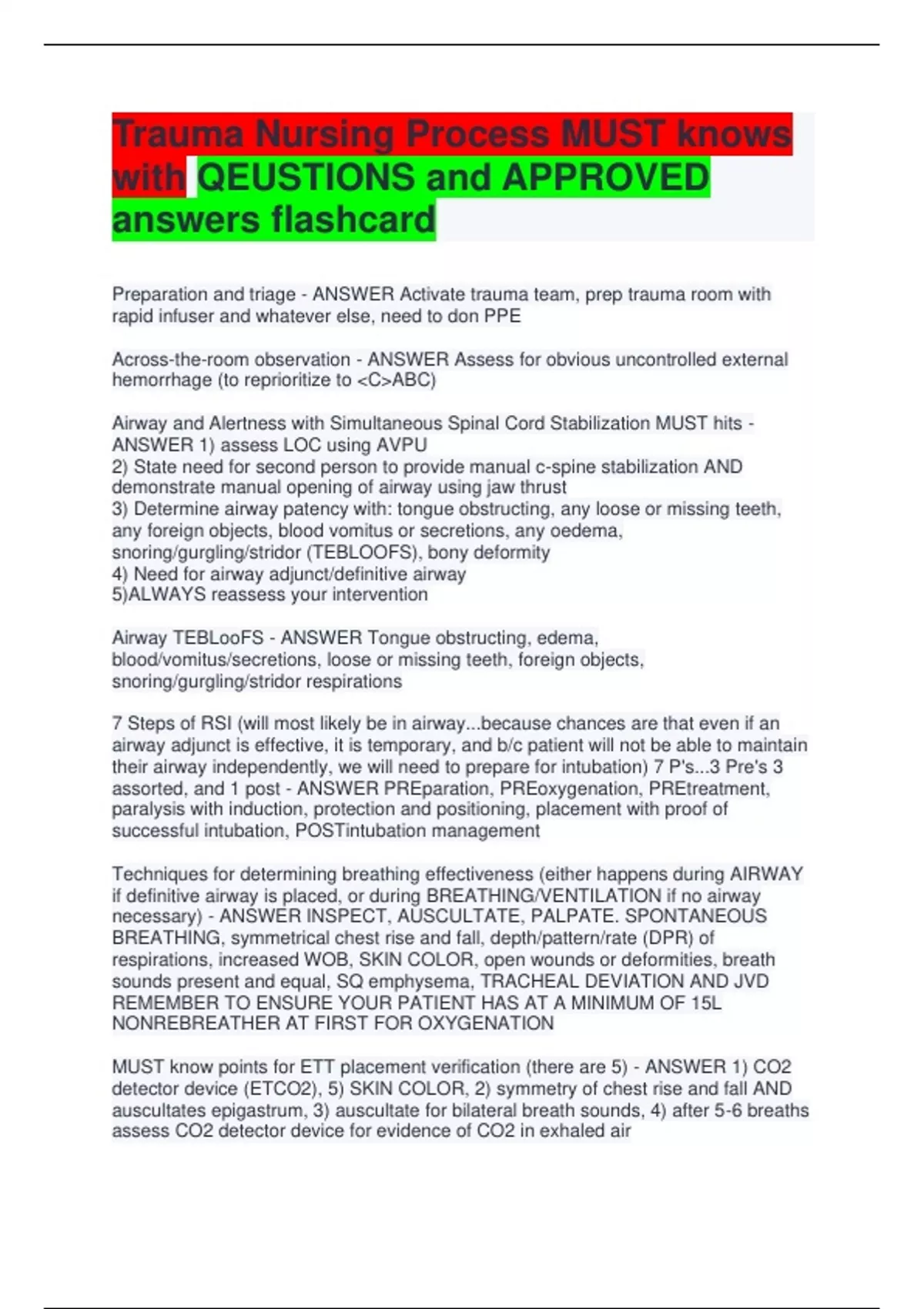 Trauma Nursing Process MUST knows with QEUSTIONS and APPROVED answers Preparation and triage - ANSWER Activate trauma team, prep trauma room with rapid infuser and whatever else, need to don PPE Across-the-room observation - ANSWER Assess for obvious uncontrolled external hemorrhage (to reprioritize to CABC) Airway and Alertness with Simultaneous Spinal Cord Stabilization MUST hits - ANSWER 1) assess LOC using AVPU 2) State need for second person to provide manual c-spine stabilization AND demonstrate manual opening of airway using jaw thrust 3) Determine airway patency with: tongue obstructing, any loose or missing teeth, any foreign objects, blood vomitus or secretions, any oedema, snoring/gurgling/stridor (TEBLOOFS), bony deformity 4) Need for airway adjunct/definitive airway 5)ALWAYS reassess your intervention Airway TEBLooFS - ANSWER Tongue obstructing, edema, blood/vomitus/secretions, loose or missing teeth, foreign objects, snoring/gurgling/stridor respirations 7 Steps of RSI (will most likely be in airway...because chances are that even if an airway adjunct is effective, it is temporary, and b/c patient will not be able to maintain their airway independently, we will need to prepare for intubation) 7 P's...3 Pre's 3 assorted, and 1 post - ANSWER PREparation, PREoxygenation, PREtreatment, paralysis with induction, protection and positioning, placement with proof of successful intubation, POSTintubation management Techniques for determining breathing effectiveness (either happens during AIRWAY if definitive airway is placed, or during BREATHING/VENTILATION if no airway necessary) - ANSWER INSPECT, AUSCULTATE, PALPATE. SPONTANEOUS BREATHING, symmetrical chest rise and fall, depth/pattern/rate (DPR) of respirations, increased WOB, SKIN COLOR, open wounds or deformities, breath sounds present and equal, SQ emphysema, TRACHEAL DEVIATION AND JVD REMEMBER TO ENSURE YOUR PATIENT HAS AT A MINIMUM OF 15L NONREBREATHER AT FIRST FOR OXYGENATION MUST know points for ETT placement verification (there are 5) - ANSWER 1) CO2 detector device (ETCO2), 5) SKIN COLOR, 2) symmetry of chest rise and fall AND auscultates epigastrium, 3) auscultate for bilateral breath sounds, 4) after 5-6 breaths assess CO2 detector device for evidence of CO2 in exhaled air