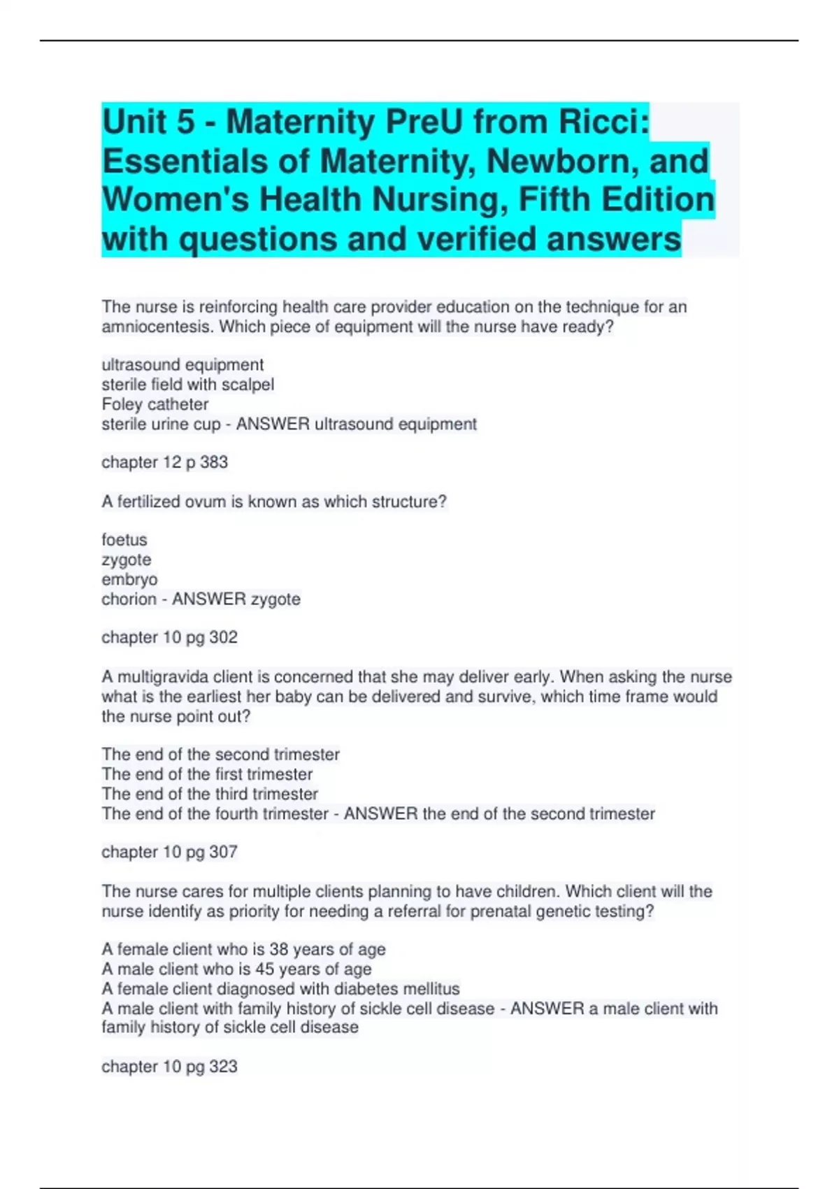 Unit 5 - Maternity PreU from Ricci: Essentials of Maternity, Newborn, and Women's Health Nursing, Fifth Edition with questions and verified answers The nurse is reinforcing health care provider education on the technique for an amniocentesis. Which piece of equipment will the nurse have ready? ultrasound equipment sterile field with scalpel Foley catheter sterile urine cup - ANSWER ultrasound equipment chapter 12 p 383 A fertilized ovum is known as which structure? foetus zygote embryo chorion - ANSWER zygote chapter 10 pg 302 A multigravida client is concerned that she may deliver early. When asking the nurse what is the earliest her baby can be delivered and survive, which time frame would the nurse point out? The end of the second trimester The end of the first trimester The end of the third trimester The end of the fourth trimester - ANSWER the end of the second trimester chapter 10 pg 307 The nurse cares for multiple clients planning to have children. Which client will the nurse identify as priority for needing a referral for prenatal genetic testing? A female client who is 38 years of age A male client who is 45 years of age A female client diagnosed with diabetes mellitus A male client with family history of sickle cell disease - ANSWER a male client with family history of sickle cell disease chapter 10 pg 323 During a prenatal visit, the nurse inspects the skin of the client's abdomen. Which would the nurse identify as an abnormal finding? bruising linea nigra striae darkening of the umbilicus - ANSWER bruising chapter 11 pg 341 At the first prenatal visit, the reports her last menstrual period (LMP) was November 16. The nurse determines the estimated due date to be: August 23 August 13 August 3 September 1 - ANSWER August 23 chapter 12 pg 372 The nurse is assessing a primigravida woman at a routine prenatal visit. Which assessment finding is reinforcing to the client that she is definitely pregnant? continued amenorrhea positive hCG blood result uterine growth ultrasound picture of her fetus - ANSWER ultrasound picture of her fetus chapter 11 pg 335 In preparing for a prenatal class to discuss the hormonal changes during pregnancy, which information would that nurse most likely include? Over-the-counter antacids can be used to treat acid reflux with the health care provider's knowledge. Most of the hormonal changes are permanent after the pregnancy is completed. Taking hormonal replacement therapy can improve the discomfort of the changes. Using herbs will help ease the discomfort. - ANSWER OTC antacids can be used to treat acid reflux with the health care provider's knowledge. chapter 11 pg 338 A pregnant client has been diagnosed with hydramnios and has been referred for further testing. To obtain family history information needed for the testing, which questions(s) should the nurse ask the client? Select all the apply. "Has anyone in your family been born with a problem with the intestines?" "Do you have a family history of children with heart defects?" "Do you have anyone in the family who has been born with a spine problem?" "Do you have anyone in the family born with Down syndrome?" "Has anyone in the family been born with kidney problems?" - ANSWER "Has anyone in your family been born with the intestine?" "Do you have anyone in the family who has been born with a spine problem?" "Do you have anyone in the family born with Down Syndrome" chapter pg 307 The nurse is teaching a prenatal class about preparing for their expanding families. What is helpful advice from the nurse? "Expect your other children to react positively to their new brother/sister." "Your old coping methods will adequately get you through this period of adjustment." "The hormones of pregnancy may cause anxiety or depression postpartum." "Caring for your new infant is instinctual and will come naturally to you." - ANSWER "The hormone of pregnancy may cause anxiety or depression postpartum" chapter 11 pg 355 A client in her third month of pregnancy arrives at the health care facility for a regular follow-up visit. The client reports discomfort due to increased urinary frequency. Which instruction should the nurse offer the client to reduce the client's discomfort? Avoid consumption of caffeinated drinks. Drink fluids with meals rather than between meals. Avoid an empty stomach at all times. Munch on dry crackers and toast in the early morning. - ANSWER Avoid consumption of caffeinated drinks chapter 12 pg 394 Nurses are expected to know how to use the first genetic test. What is it? the developmental assessment the family history the physical assessment the psychosocial assessment - ANSWER the family history chapter 10 pg 325 A pregnant client at 24 weeks' gestation calls the clinic crying after a prenatal visit, where she had pelvic exam. She states that she noticed blood on the tissue when she wiped after voiding. What initial statement by the nurse would explain this finding? The cervix is very vascular during pregnancy, so spotting after a pelvic exam is not unusual. She may have a bleeding disorder so she needs to come back to the clinic for blood work. It is possible she is losing her mucus plug, which can cause bloody show.