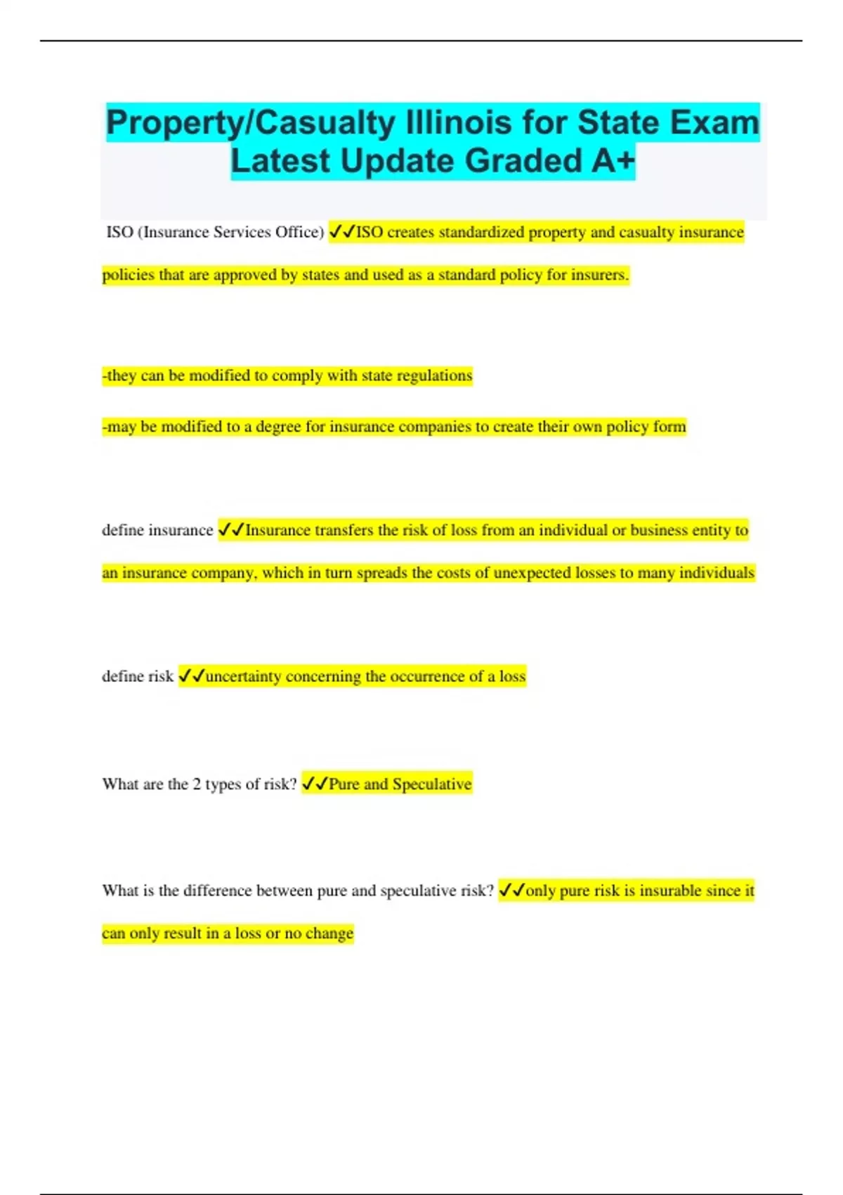 Property/Casualty Illinois for State Exam Latest Update Graded A+ ISO (Insurance Services Office) ISO creates standardized property and casualty insurance policies that are approved by states and used as a standard policy for insurers. -they can be modified to comply with state regulations -may be modified to a degree for insurance companies to create their own policy form define insurance Insurance transfers the risk of loss from an individual or business entity to an insurance company, which in turn spreads the costs of unexpected losses to many individuals define risk uncertainty concerning the occurrence of a loss What are the 2 types of risk? Pure and Speculative What is the difference between pure and speculative risk? only pure risk is insurable since it can only result in a loss or no change