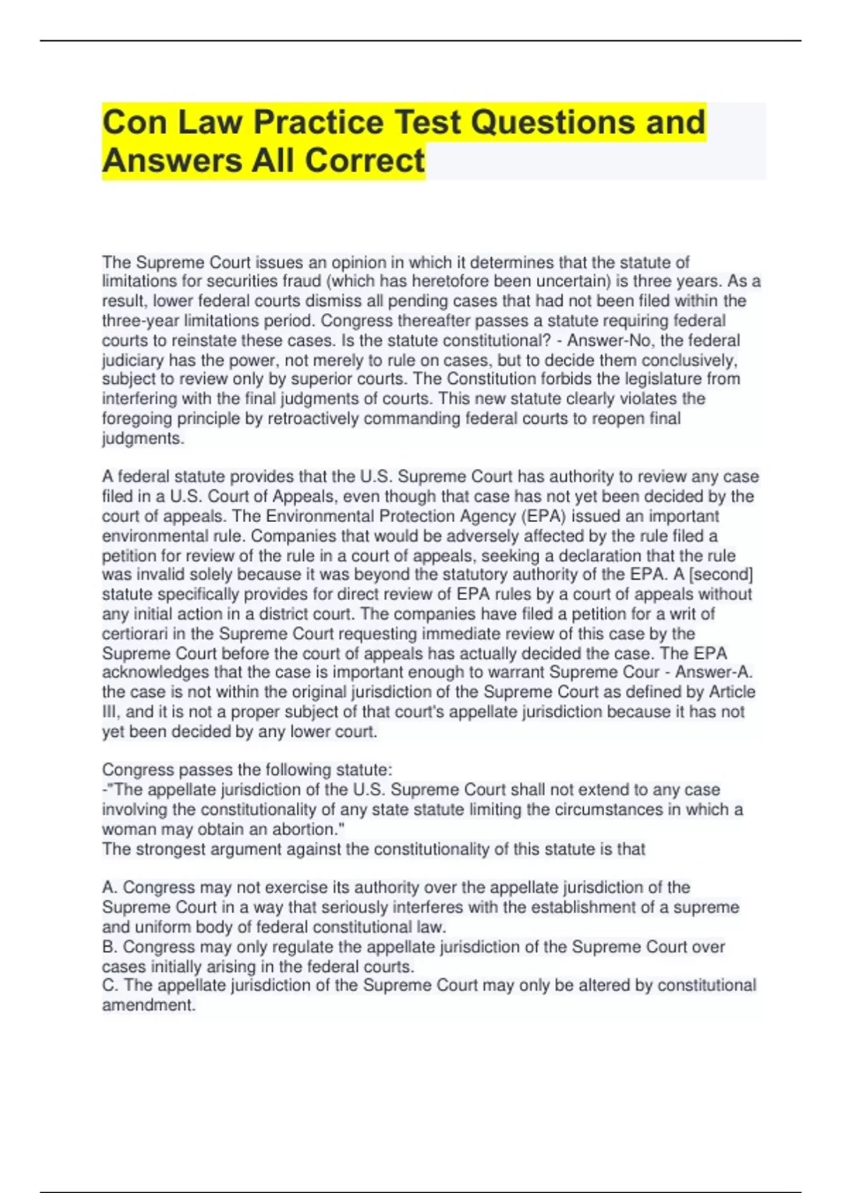 Con Law Practice Test Questions and Answers All Correct The Supreme Court issues an opinion in which it determines that the statute of limitations for securities fraud (which has heretofore been uncertain) is three years. As a result, lower federal courts dismiss all pending cases that had not been filed within the three-year limitations period. Congress thereafter passes a statute requiring federal courts to reinstate these cases. Is the statute constitutional? - Answer-No, the federal judiciary has the power, not merely to rule on cases, but to decide them conclusively, subject to review only by superior courts. The Constitution forbids the legislature from interfering with the final judgments of courts. This new statute clearly violates the foregoing principle by retroactively commanding federal courts to reopen final judgments. A federal statute provides that the U.S. Supreme Court has authority to review any case filed in a U.S. Court of Appeals, even though that case has not yet been decided by the court of appeals. The Environmental Protection Agency (EPA) issued an important environmental rule. Companies that would be adversely affected by the rule filed a petition for review of the rule in a court of appeals, seeking a declaration that the rule was invalid solely because it was beyond the statutory authority of the EPA. A [second] statute specifically provides for direct review of EPA rules by a court of appeals without any initial action in a district court. The companies have filed a petition for a writ of certiorari in the Supreme Court requesting immediate review of this case by the Supreme Court before the court of appeals has actually decided the case. The EPA acknowledges that the case is important enough to warrant Supreme Cour - Answer-A. the case is not within the original jurisdiction of the Supreme Court as defined by Article III, and it is not a proper subject of that court's appellate jurisdiction because it has not yet been decided by any lower court. Congress passes the following statute: -"The appellate jurisdiction of the U.S. Supreme Court shall not extend to any case involving the constitutionality of any state statute limiting the circumstances in which a woman may obtain an abortion." The strongest argument against the constitutionality of this statute is that A. Congress may not exercise its authority over the appellate jurisdiction of the Supreme Court in a way that seriously interferes with the establishment of a supreme and uniform body of federal constitutional law. B. Congress may only regulate the appellate jurisdiction of the Supreme Court over cases initially arising in the federal courts. C. The appellate jurisdiction of the Supreme Court may only be altered by constitutional amendment. D. The statute violates the equal protection clause. - Answer-A. Congress may not exercise its authority over the appellate jurisdiction of the Supreme Court in a way that seriously interferes with the establishment of a supreme and uniform body of federal constitutional law. The president is considering selling arms to Israel. There is an old statute on the books prohibiting arms sales to "Middle-Eastern" countries. The president is unsure whether this statute applies to Israel, so he asks the Supreme Court for advice. What result? - Answer-The president is seeking an advisory opinion, which federal courts cannot issue. Congress passes a statute permitting persons with claims arising out of the recent war to bring suit against the U.S. government in federal court. If the federal court rules in favor of the claimant, the statute authorizes the Department of Defense to pay such claims if the Department of Defense determines that the judicial award was "just and equitable." Otherwise, the Department of Defense may reject such claims. Is this statute constitutional? - Answer-No, because the statute, in effect, renders federal court decisions non-final, advisory opinions. Old City police officers shot and killed J's friend as he was attempting to escape arrest for armed robbery. J brought suit in federal court against the Old City Police Department seeking only a judgment declaring unconstitutional the state statute under which the police acted. The statute authorized the police to use deadly force when necessary to apprehend a person who has committed a felony. In his suit, J alleged that the police would not have killed his friend if the use of deadly force had not been authorized by the statute. The court should A. Decide the case on the merits, because it raise a substantial federal question. B. Dismiss the action, because it involves a nonjusticiable political question. C. Dismiss the action, because it does not present a case or controversy. D. Dismiss the action, because the 11th Amendment prohibits federal courts from deciding cases of this type. - Answer-C. Dismiss the action, because it does not present a case or controversy. The legislature of the state of Gray recently enacted a statute forbidding public utilities regulated by the Gray Public Service Commission to increase their rates more than once every two years. Economy Electric Power Company, a public utility regulated by that commission, has just obtained approval of the commission for a general rate increase. Economy Electric has routinely filed for a rate increase every ten to 14 months during the last 20 years. Because of uncertainties about future fuel prices, the power company cannot ascertain with any certainty the date when it will need a further rate increase; but it thinks it may need such an increase sometime within the next 18 months. Economy Electric files an action in the federal district court in Gray requesting a declaratory judgment that this new statute of Gray forbidding public utility rate increases more often than once every two years is unconstitutional. Assum - Answer-(C) dismiss the complaint, because this action is not ripe for decision. Alex contracted for expensive cable tele