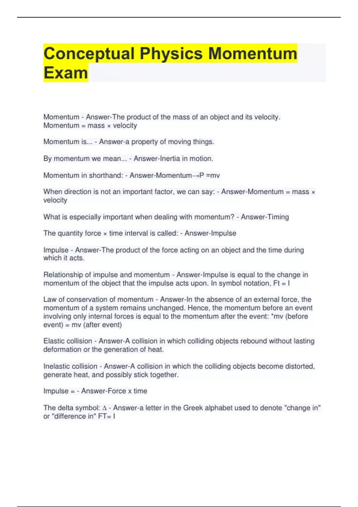 Conceptual Physics Momentum Exam Momentum - Answer-The product of the mass of an object and its velocity. Momentum = mass × velocity Momentum is... - Answer-a property of moving things. By momentum we mean... - Answer-Inertia in motion. Momentum in shorthand: - Answer-Momentum→Ρ =mv When direction is not an important factor, we can say: - Answer-Momentum = mass × velocity What is especially important when dealing with momentum? - Answer-Timing The quantity force × time interval is called: - Answer-Impulse Impulse - Answer-The product of the force acting on an object and the time during which it acts. Relationship of impulse and momentum - Answer-Impulse is equal to the change in momentum of the object that the impulse acts upon. In symbol notation, Ft = I Law of conservation of momentum - Answer-In the absence of an external force, the momentum of a system remains unchanged. Hence, the momentum before an event involving only internal forces is equal to the momentum after the event: *mv (before event) = mv (after event) Elastic collision - Answer-A collision in which colliding objects rebound without lasting deformation or the generation of heat. Inelastic collision - Answer-A collision in which the colliding objects become distorted, generate heat, and possibly stick together. Impulse = - Answer-Force x time The delta symbol: ∆ - Answer-a letter in the Greek alphabet used to denote "change in" or "difference in" FT= I