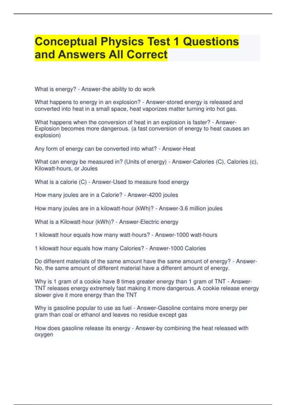 Conceptual Physics Test 1 Questions and Answers All Correct What is energy? - Answer-the ability to do work What happens to energy in an explosion? - Answer-stored energy is released and converted into heat in a small space, heat vaporizes matter turning into hot gas. What happens when the conversion of heat in an explosion is faster? - AnswerExplosion becomes more dangerous. (a fast conversion of energy to heat causes an explosion) Any form of energy can be converted into what? - Answer-Heat What can energy be measured in? (Units of energy) - Answer-Calories (C), Calories (c), Kilowatt-hours, or Joules What is a calorie (C) - Answer-Used to measure food energy How many joules are in a Calorie? - Answer-4200 joules How many joules are in a kilowatt-hour (kWh)? - Answer-3.6 million joules What is a Kilowatt-hour (kWh)? - Answer-Electric energy 1 kilowatt hour equals how many watt-hours? - Answer-1000 watt-hours 1 kilowatt hour equals how many Calories? - Answer-1000 Calories Do different materials of the same amount have the same amount of energy? - AnswerNo, the same amount of different material have a different amount of energy. Why is 1 gram of a cookie have 8 times greater energy than 1 gram of TNT - AnswerTNT releases energy extremely fast making it more dangerous. A cookie release energy slower give it more energy than the TNT Why is gasoline popular to use as fuel - Answer-Gasoline contains more energy per gram than coal or ethanol and leaves no residue except gas How does gasoline release its energy - Answer-by combining the heat released with oxygen What does batteries store - Answer-chemical energy What is chemical energy capable of - Answer-releasing electrons of their atoms which carries its energy electric energy is easily - Answer-transportable Why are batteries used to start a car rather than gasoline - Answer-batteries contain a low amount of energy, batteries are used to start because they are fast and gasoline is used as its source In an automobile battery lead and sulfuric acid react to generate - Answer-electricity