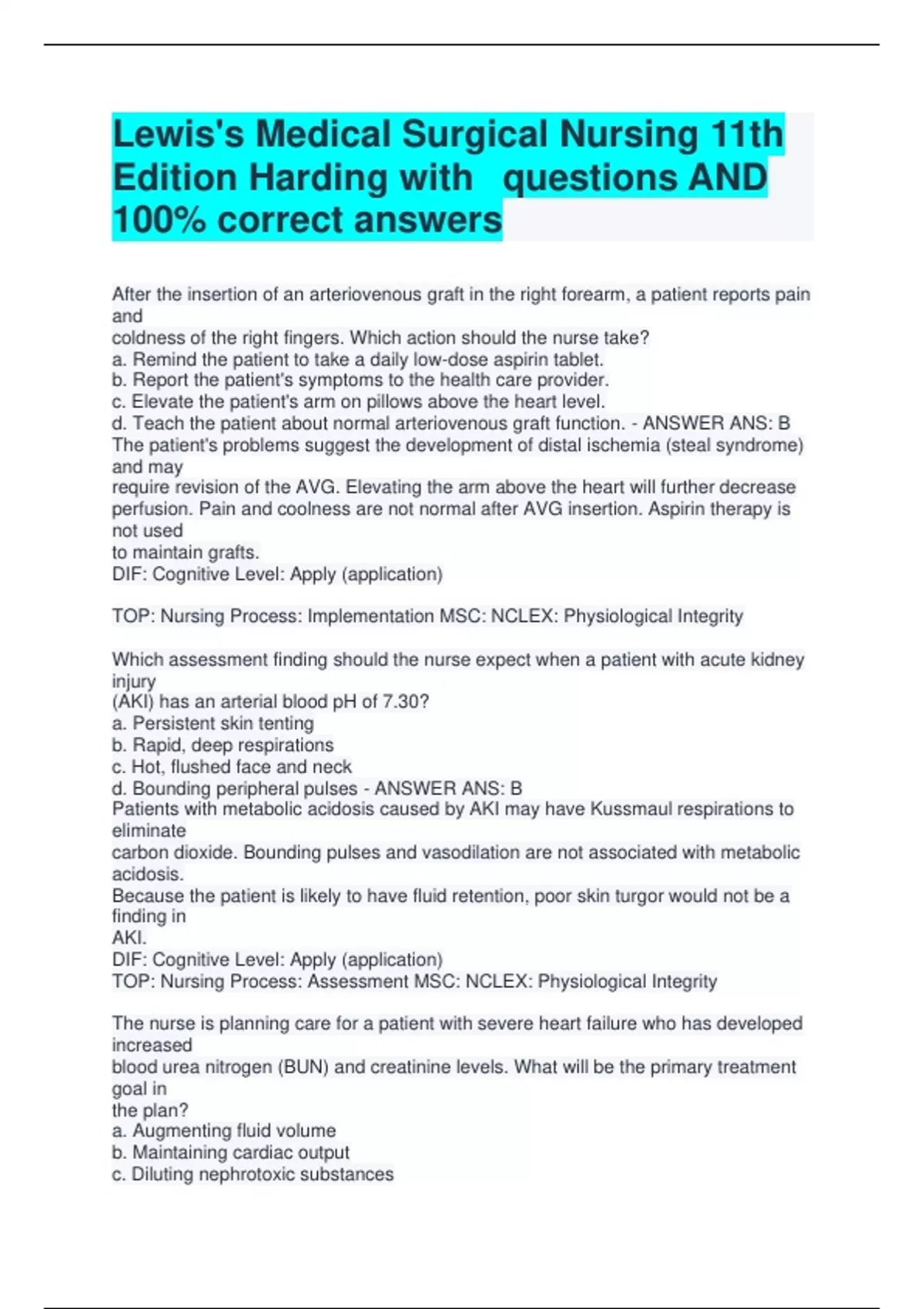 Lewis's Medical Surgical Nursing 11th Edition Harding with questions AND 100% correct answers After the insertion of an arteriovenous graft in the right forearm, a patient reports pain and coldness of the right fingers. Which action should the nurse take? a. Remind the patient to take a daily low-dose aspirin tablet. b. Report the patient's symptoms to the health care provider. c. Elevate the patient's arm on pillows above the heart level. d. Teach the patient about normal arteriovenous graft function. - ANSWER ANS: B The patient's problems suggest the development of distal ischemia (steal syndrome) and may require revision of the AVG. Elevating the arm above the heart will further decrease perfusion. Pain and coolness are not normal after AVG insertion. Aspirin therapy is not used to maintain grafts. DIF: Cognitive Level: Apply (application) TOP: Nursing Process: Implementation MSC: NCLEX: Physiological Integrity Which assessment finding should the nurse expect when a patient with acute kidney injury (AKI) has an arterial blood pH of 7.30? a. Persistent skin tenting b. Rapid, deep respirations c. Hot, flushed face and neck d. Bounding peripheral pulses - ANSWER ANS: B Patients with metabolic acidosis caused by AKI may have Kussmaul respirations to eliminate carbon dioxide. Bounding pulses and vasodilation are not associated with metabolic acidosis. Because the patient is likely to have fluid retention, poor skin turgor would not be a finding in AKI. DIF: Cognitive Level: Apply (application) TOP: Nursing Process: Assessment MSC: NCLEX: Physiological Integrity The nurse is planning care for a patient with severe heart failure who has developed increased blood urea nitrogen (BUN) and creatinine levels. What will be the primary treatment goal in the plan? a. Augmenting fluid volume b. Maintaining cardiac output c. Diluting nephrotoxic substances
