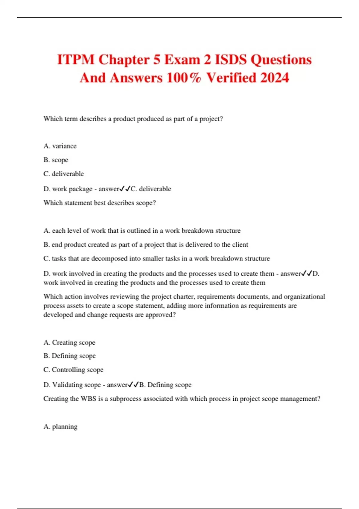 ITPM Chapter 5 Exam 2 ISDS Questions And Answers 100% Verified 2024 Which term describes a product produced as part of a project? A. variance B. scope C. deliverable D. work package - answerC. deliverable Which statement best describes scope? A. each level of work that is outlined in a work breakdown structure B. end product created as part of a project that is delivered to the client C. tasks that are decomposed into smaller tasks in a work breakdown structure D. work involved in creating the products and the processes used to create them - answerD. work involved in creating the products and the processes used to create them Which action involves reviewing the project charter, requirements documents, and organizational process assets to create a scope statement, adding more information as requirements are developed and change requests are approved? A. Creating scope B. Defining scope C. Controlling scope D. Validating scope - answerB. Defining scope Creating the WBS is a subprocess associated with which process in project scope management? A. planning