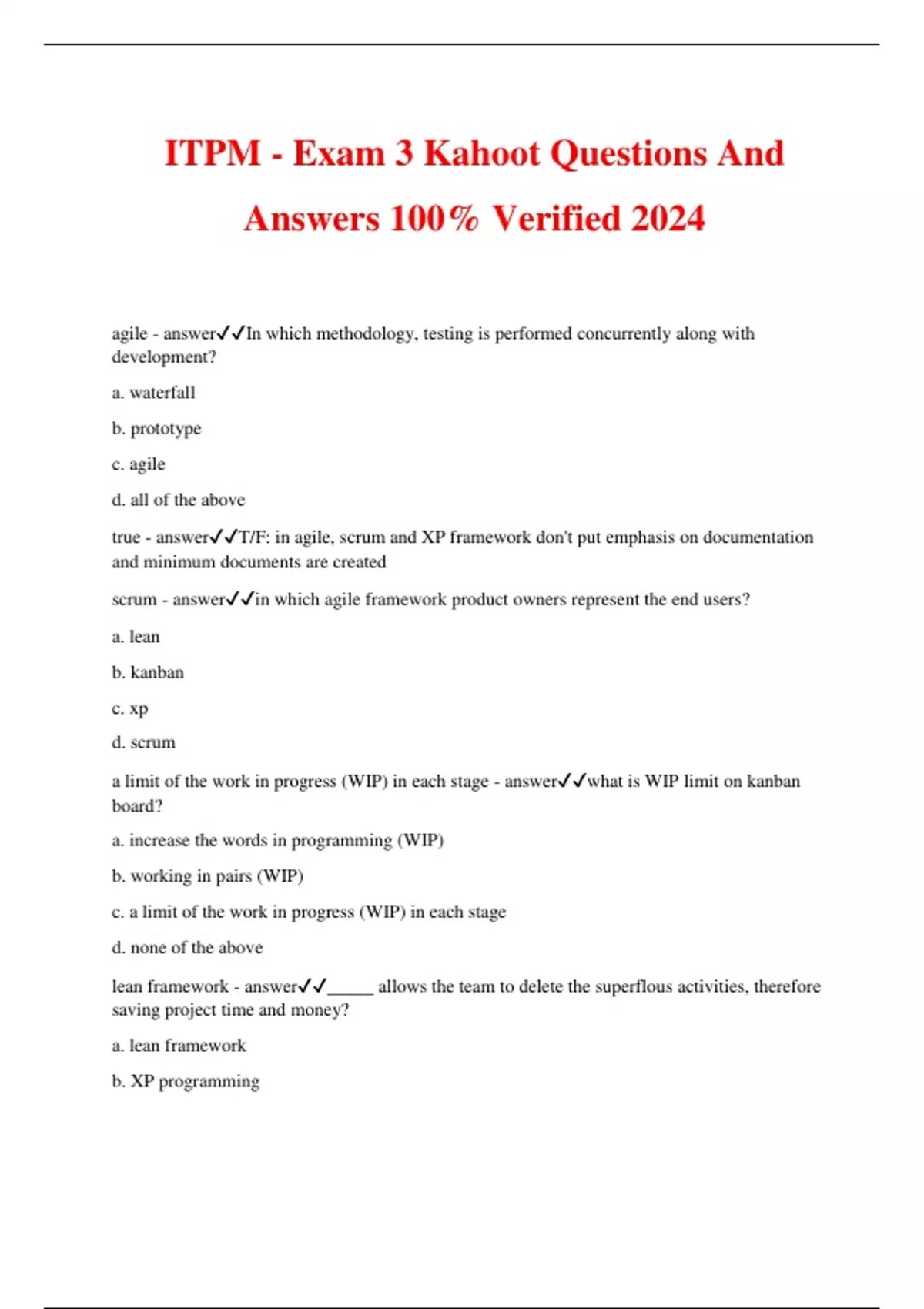 ITPM - Exam 3 Kahoot Questions And Answers 100% Verified 2024 agile - answerIn which methodology, testing is performed concurrently along with development? a. waterfall b. prototype c. agile d. all of the above true - answerT/F: in agile, scrum and XP framework don't put emphasis on documentation and minimum documents are created scrum - answerin which agile framework product owners represent the end users? a. lean b. kanban c. xp d. scrum a limit of the work in progress (WIP) in each stage - answerwhat is WIP limit on kanban board? a. increase the words in programming (WIP) b. working in pairs (WIP) c. a limit of the work in progress (WIP) in each stage d. none of the above lean framework - answer_____ allows the team to delete the superflous activities, therefore saving project time and money? a. lean framework b. XP programming