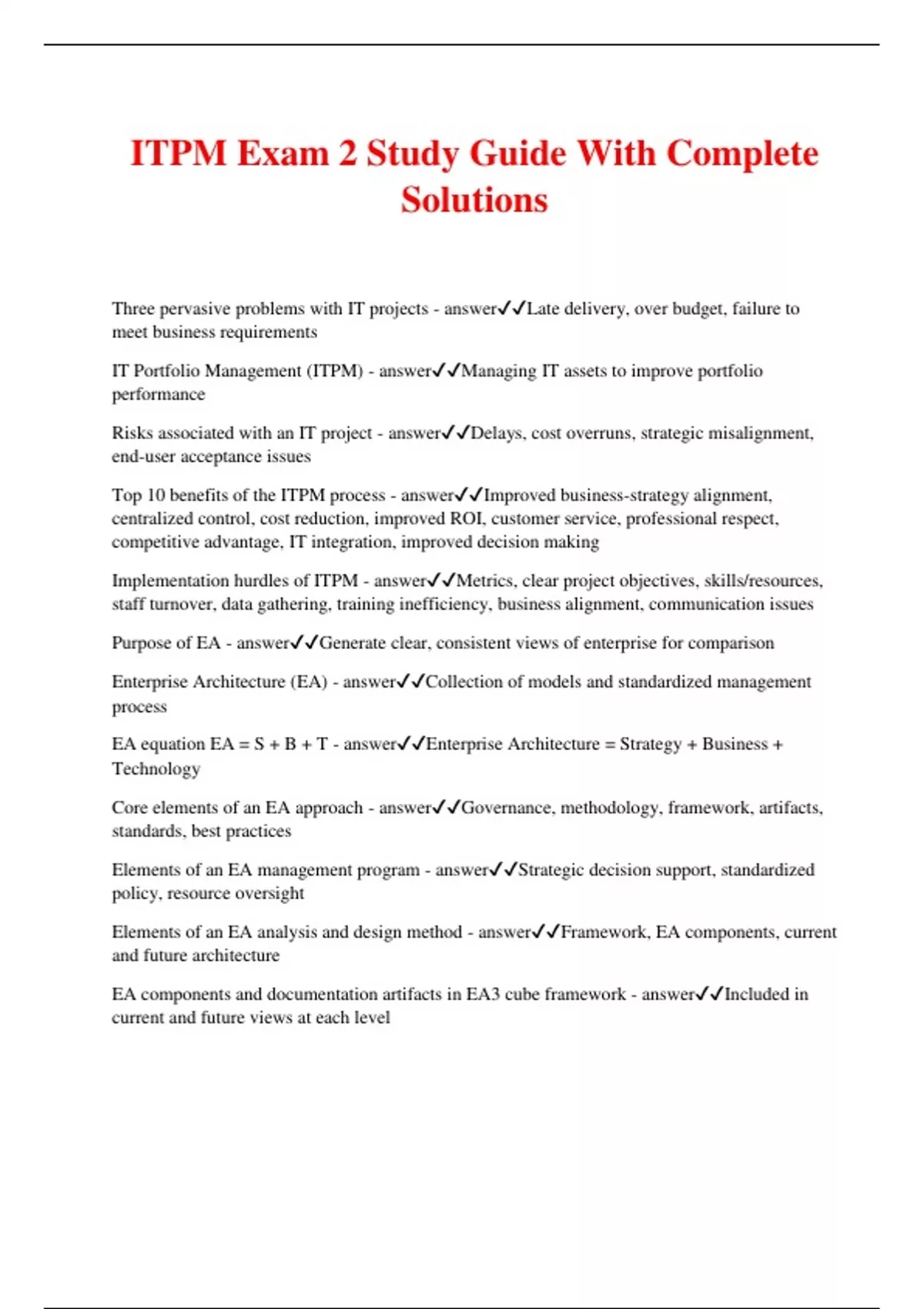ITPM Exam 2 Study Guide With Complete Solutions Three pervasive problems with IT projects - answerLate delivery, over budget, failure to meet business requirements IT Portfolio Management (ITPM) - answerManaging IT assets to improve portfolio performance Risks associated with an IT project - answerDelays, cost overruns, strategic misalignment, end-user acceptance issues Top 10 benefits of the ITPM process - answerImproved business-strategy alignment, centralized control, cost reduction, improved ROI, customer service, professional respect, competitive advantage, IT integration, improved decision making