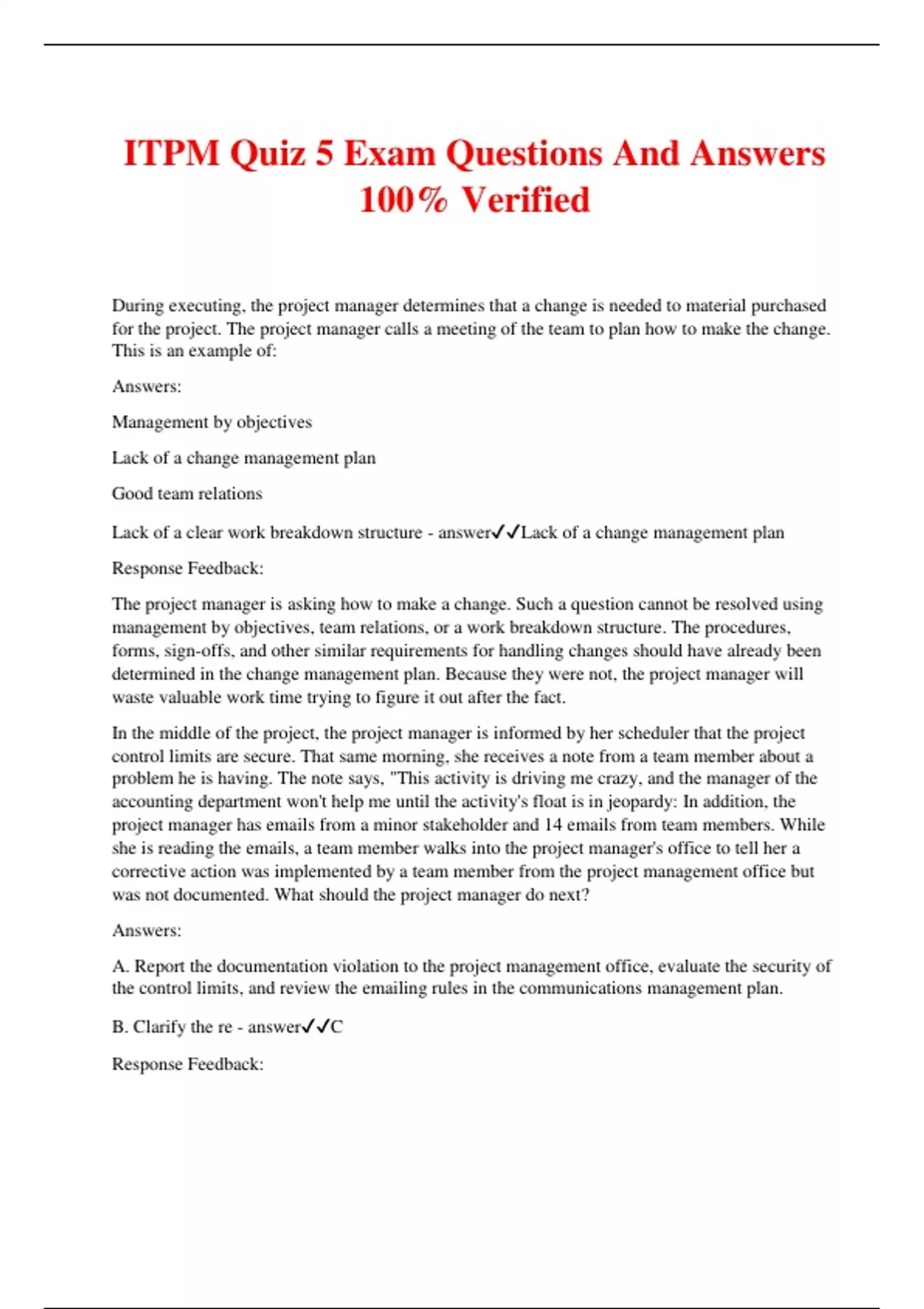 ITPM Quiz 5 Exam Questions And Answers 100% Verified During executing, the project manager determines that a change is needed to material purchased for the project. The project manager calls a meeting of the team to plan how to make the change. This is an example of: Answers: Management by objectives Lack of a change management plan Good team relations Lack of a clear work breakdown structure - answerLack of a change management plan Response Feedback: The project manager is asking how to make a change. Such a question cannot be resolved using management by objectives, team relations, or a work breakdown structure. The procedures, forms, sign-offs, and other similar requirements for handling changes should have already been determined in the change management plan. Because they were not, the project manager will waste valuable work time trying to figure it out after the fact. In the middle of the project, the project manager is informed by her scheduler that the project control limits are secure. That same morning, she receives a note from a team member about a problem he is having. The note says, "This activity is driving me crazy, and the manager of the accounting department won't help me until the activity's float is in jeopardy: In addition, the project manager has emails from a minor stakeholder and 14 emails from team members. While she is reading the emails, a team member walks into the project manager's office to tell her a corrective action was implemented by a team member from the project management office but was not documented. What should the project manager do next? Answers: A. Report the documentation violation to the project management office, evaluate the security of the control limits, and review the emailing rules in the communications management plan. B. Clarify the re - answerC Response Feedback: Notice how much information is thrown at you in this question. It is important to practice reading through questions to discover what is important and what is simply background information. In this question, the only thing relevant was the corrective action taken. Once you discover what the primary issue is, look at the choices to find out which is best for addressing that issue. What is the primary issue here? Did you realize the team member's note is about a non-critical path activity? ("Until the project float is in jeopardy" means there is float; thus, the activity is not on the critical path.) So, is the issue the non-critical path activity or the documentation? You might disagree with the logic, but in this case, the answer is the documentation. In the real world, problems often repeat. Without a record of what was done, there is no opportunity to consider the same solution for future problems. Documentation is critical to projects. Because the change log becomes part of the historical records database, it is best to first record the corrective action taken, then discuss the value of documentation at the next team meeting, and, finally, smooth the team member's issue with the accounting department. Which of the following is included in a project charter? Answers: A risk management strategy Work package estimates Detailed resource estimates The business case for the project - answerThe business case for the project Response Feedback: A risk management strategy and work package estimates are not created until project planning, but the project charter is created in initiating. A project charter may include the names of some resources (the project manager, for example), but not detailed resource estimates. Of the choices given, only the business case for the project is included in the project charter An output of the Close Project or Phase process is the creation of Answers: Project archives A project charter A project management plan A risk management plan - answerProject archives Response Feedback: The project charter is created in initiating. The project management plan and risk management plan are the outputs of project planning. Project records, including the charter and all management plans, are archived in the Close Project or Phase process. The project was going well when all of a sudden there were changes to the project coming from multiple stakeholders. After all the changes were determined, the project manager spent time with the stakeholders to find out why there were changes and to discover any more. The project work had quieted down when a team member casually mentioned to the project manager that he added functionality to a product of the project. "Do not worry;' he said, "I did not impact schedule, cost, or quality!" What should the project manager do first? Answers: A. Ask the team member how the need for the functionality was determined. B. Hold a meeting to review the team member's completed work. C. Look for other added functionality. D. Ask the team member how he knows there is no schedule, cost, or quality impact. - answerAsk the team member how he knows there is no schedule, cost, or quality impact. Response Feedback: Notice that the first paragraph is extraneous. Also, notice that the question states that the change has already been made. The project manager's actions would be different if the change had not been made. The project manager, with the help of others, must determine how the change impacts the project as a whole. Asking the team member how he knows there is no impact on schedule, cost, or quality is the best answer. This begins the project manager's analysis of the impacts of the project as a whole by finding out what analysis has already been done. This change minimally involves a change to the scope baseline, and likely other baselines as well. A change request must ultimately be submitted to integrated change control, but that is not listed as an option. You are the project manager for an existing year-long project that must be completed. Your company just won a major new project. It will begin in three months and is valued at $2,000,0