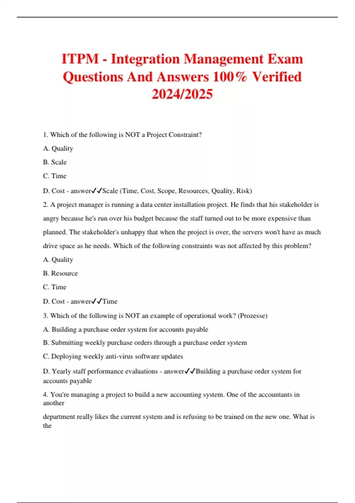 ITPM - Integration Management Exam Questions And Answers 100% Verified 2024/2025 1. Which of the following is NOT a Project Constraint? A. Quality B. Scale C. Time D. Cost - answerScale (Time, Cost, Scope, Resources, Quality, Risk) 2. A project manager is running a data center installation project. He finds that his stakeholder is angry because he's run over his budget because the staff turned out to be more expensive than planned. The stakeholder's unhappy that when the project is over, the servers won't have as much drive space as he needs. Which of the following constraints was not affected by this problem? A. Quality B. Resource C. Time D. Cost - answerTime 3. Which of the following is NOT an example of operational work? (Prozesse) A. Building a purchase order system for accounts payable B. Submitting weekly purchase orders through a purchase order system C. Deploying weekly anti-virus software updates D. Yearly staff performance evaluations - answerBuilding a purchase order system for accounts payable 4. You're managing a project to build a new accounting system. One of the accountants in another department really likes the current system and is refusing to be trained on the new one. What is the