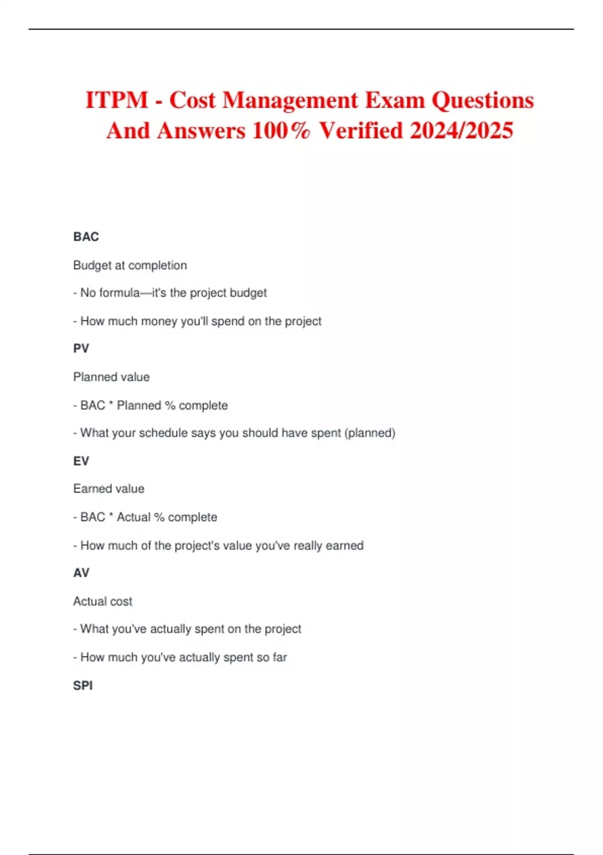 ITPM - Cost Management Exam Questions And Answers 100% Verified 2024/2025 BAC Budget at completion - No formula—it's the project budget - How much money you'll spend on the project PV Planned value - BAC * Planned % complete - What your schedule says you should have spent (planned) EV Earned value - BAC * Actual % complete - How much of the project's value you've really earned AV Actual cost - What you've actually spent on the project - How much you've actually spent so far SPI Schedule performance index - EV / PV - Whether you're behind or ahead of schedule (>1 ahead) SV Schedule variance - EV-PV - How much behind or ahead of schedule you are (money) CPI Cost performance index - EV-AC - Whether you're within your budget or not (>1 within) CV Cost variance - EV-AC - How much above or below your budget you are EAC Estimate at completion - BAC/CPI - What your project will actually cost when it's complete. ETC Estimate to complete - EAC-AC - How much more money you'll probably spend on your project.