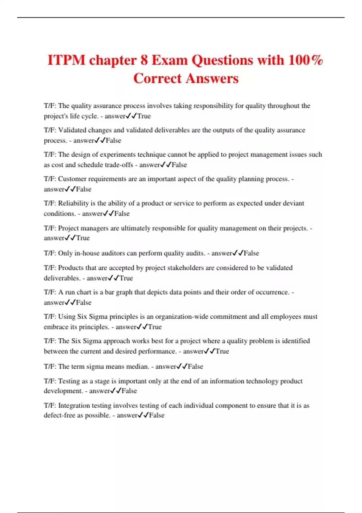 ITPM chapter 8 Exam Questions with 100% Correct Answers T/F: The quality assurance process involves taking responsibility for quality throughout the project's life cycle. - answerTrue T/F: Validated changes and validated deliverables are the outputs of the quality assurance process. - answerFalse T/F: The design of experiments technique cannot be applied to project management issues such as cost and schedule trade-offs - answerFalse T/F: Customer requirements are an important aspect of the quality planning process. - answerFalse T/F: Reliability is the ability of a product or service to perform as expected under deviant conditions. - answerFalse T/F: Project managers are ultimately responsible for quality management on their projects. - answerTrue T/F: Only in-house auditors can perform quality audits. - answerFalse T/F: Products that are accepted by project stakeholders are considered to be validated deliverables. - answerTrue T/F: A run chart is a bar graph that depicts data points and their order of occurrence. - answerFalse T/F: Using Six Sigma principles is an organization-wide commitment and all employees must embrace its principles. - answerTrue T/F: The Six Sigma approach works best for a project where a quality problem is identified between the current and desired performance. - answerTrue T/F: The term sigma means median. - answerFalse T/F: Testing as a stage is important only at the end of an information technology product development. - answerFalse T/F: Integration testing involves testing of each individual component to ensure that it is as defect-free as possible. - answerFalse