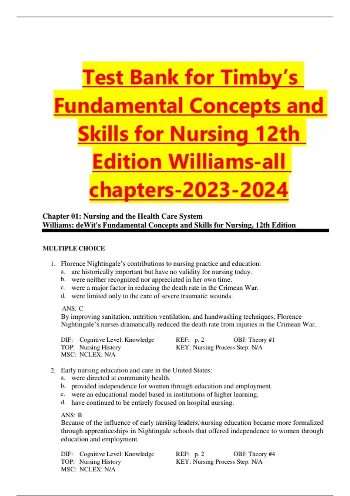 Test Bank for Timby's Fundamental Nursing Skills and Concepts 12th Edition- 9781975141769, All Chapters with Answers, Download Pdf