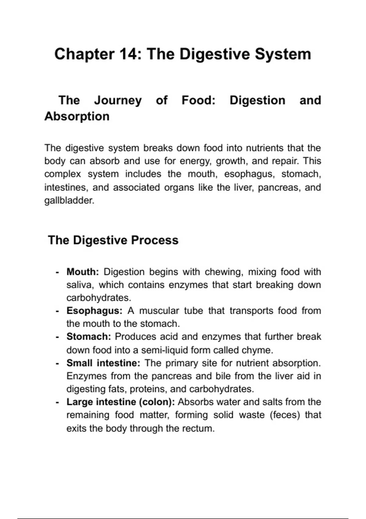 Description: Details the process of digestion and nutrient absorption. Keywords: Stomach, Intestines, Digestive System. Questions: How does the digestive system break down food? What is the role of the digestive system in nutrient absorption?