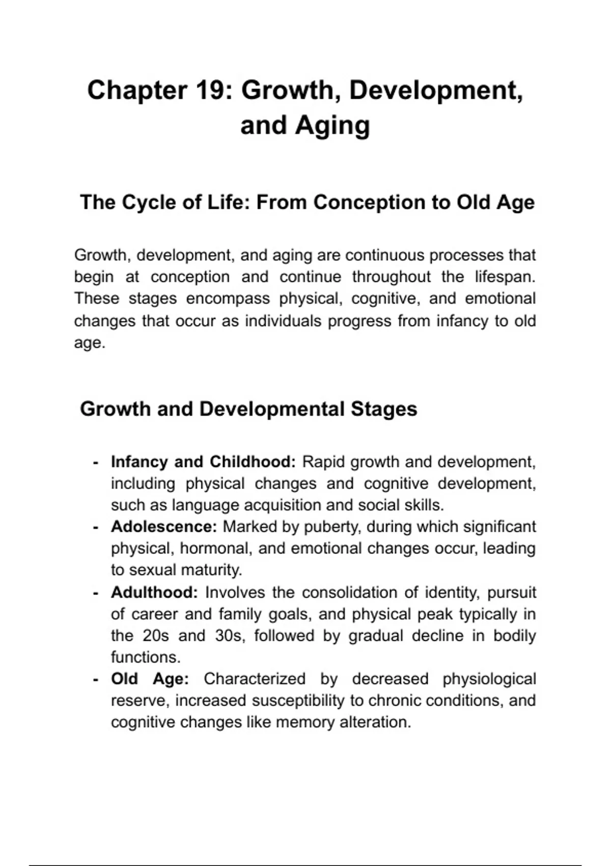Description: Covers the stages of human life and the aging process. Keywords: Growth, Development, Aging. Questions: What are the stages of human growth and development? How does the body change with age?
