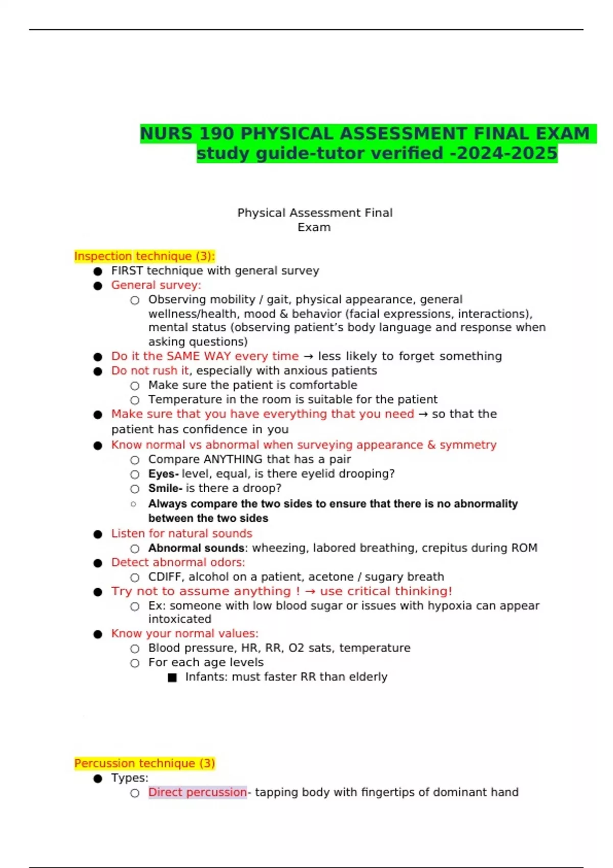 NURS 190 PHYSICAL ASSESSMENT FINAL EXAM study guide-tutor verified -
