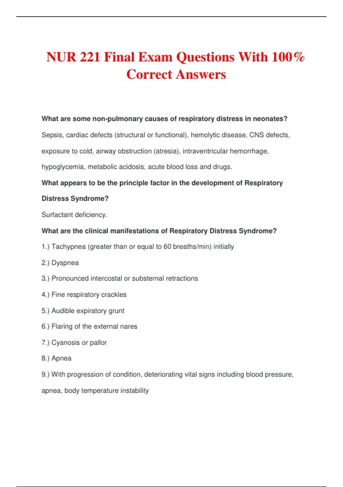 NUR 221 Final Exam Questions With 100% Correct Answers What are some non-pulmonary causes of respiratory distress in neonates? Sepsis, cardiac defects (structural or functional), hemolytic disease, CNS defects, exposure to cold, airway obstruction (atresia), intraventricular hemorrhage, hypoglycemia, metabolic acidosis, acute blood loss and drugs. What appears to be the principle factor in the development of Respiratory Distress Syndrome? Surfactant deficiency. What are the clinical manifestations of Respiratory Distress Syndrome? 1.) Tachypnea (greater than or equal to 60 breaths/min) initially 2.) Dyspnea 3.) Pronounced intercostal or substernal retractions 4.) Fine respiratory crackles 5.) Audible expiratory grunt 6.) Flaring of the external nares 7.) Cyanosis or pallor 8.) Apnea 9.) With progression of condition, deteriorating vital signs including blood pressure, apnea, body temperature instability In addition to Respiratory Distress Syndrome, what is surfactant therapy also being used in? Infants with meconium aspiration, infectious pneumonia, sepsis, persistent pulmonary hypertension, and pulmonary hemorrhage. How is surfactant administered? Via an endotracheal (ET) tube directly into the infant's trachea. What is Acrocyanosis? The bluish discoloration of the hands and feet that is a normal finding within the first 24 hours after birth. What are the clinical manifestations of Infants of Diabetic Mothers (IDMs)? 1.) Large for gestational age (>4g) 2.) Very plump and full faced 3.) Abundant vernix caseosa 4.) Plethora 5.) Listless and lethargic 6.) Possibly meconium stained at birth 7.) Hypotonia What are the risk factors for hypoglycemia in the infant? Hypoglycemia in IDMs is related to hypertrophy and hyperplasia of the pancreatic islet cells and the transient state of hyperinsulinism. High maternal blood glucose levels during fetal life provide a continual stimulus to the fetal islet cells for insulin production (glucose easily passes the placental barrier from maternal to fetal side, however, insulin does not cross the placental barrier). When the neonate's glucose supply is removed abruptly at the time of birth, the continued production of insulin soon depletes the blood of circulating glucose, creating a state of hyperinsulinism and hypoglycemia within 0.5 to 4 hours, especially in infants of mothers with poorly controlled diabetes. What is the single most important factor that influences fetal well being in a diabetic mother? The euglycemic status of the mother. What serum glucose level should be maintained in an infant with abnormal clinical symptoms? Above 40 mg/dL and as high as 55 to 65 mg/dL in other infants. What are the signs and symptoms of hypoglycemia in the newborn? Jitteriness, lethargy, poor feeding, abnormal cry, hypotonia, temperature instability (hypothermia), respiratory distress, apnea, and seizures. What are the characteristics of meconium stained amniotic fluid? It is green, and it is either thin (light) or thick (heavy), depending on the amount of meconium present. What are the three possible reasons for the passage of meconium in the amniotic fluid? 1.) It is a normal physiologic function that occurs with maturity (meconium passage being infrequent before weeks 23 or 24, with an increased incidence after 38 weeks) or with a breech presentation. 2.) It is the result of hypoxia induced peristalsis and sphincter relaxation. 3.) It can be a sequel to umbi