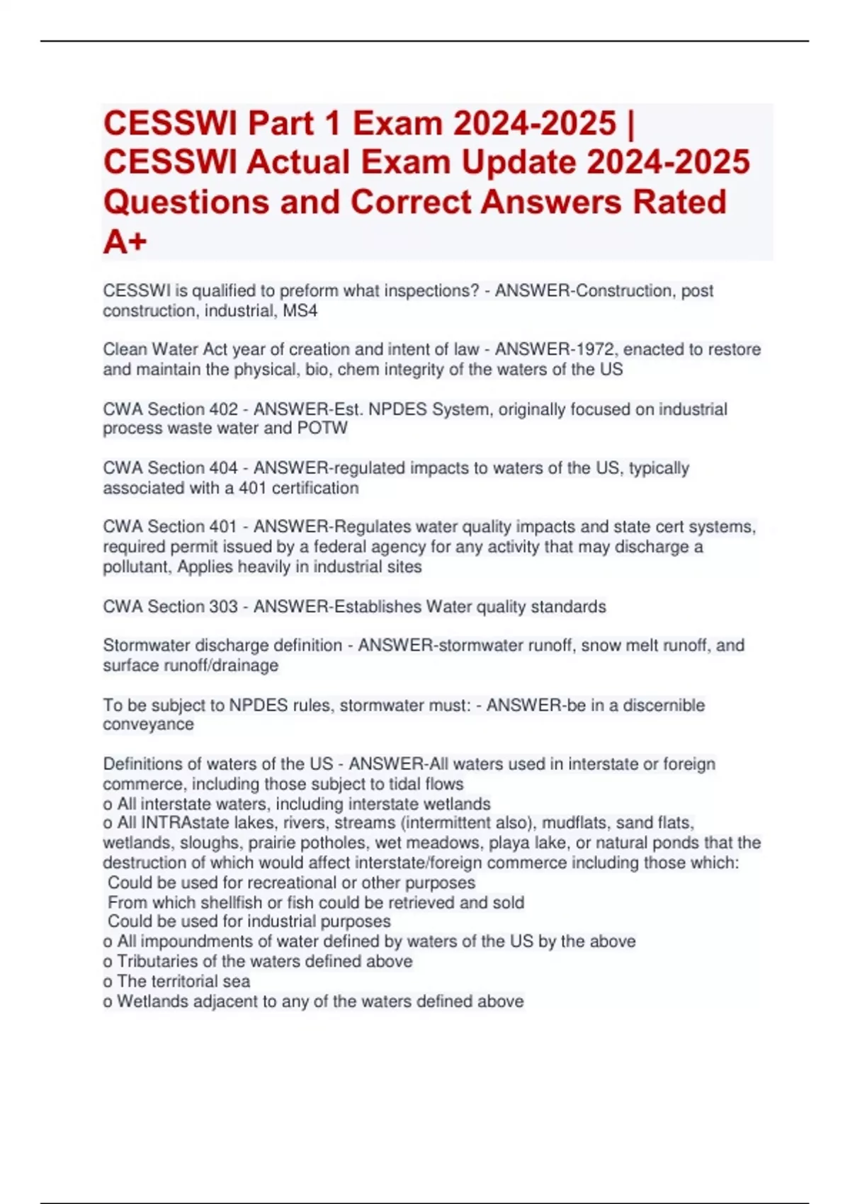 CESSWI Part 1 Exam | CESSWI Actual Exam Update Questions and Correct Answers Rated A+