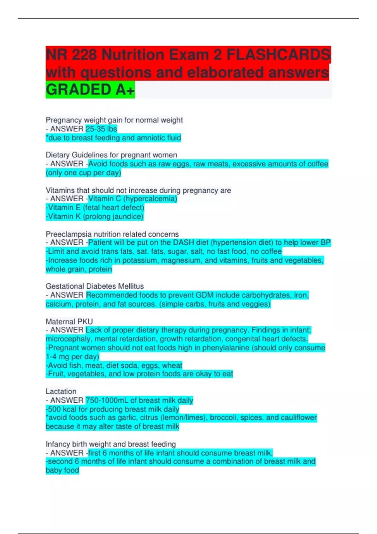 NR 228 Nutrition Exam 2 with questions and elaborated answers GRADED A+ Pregnancy weight gain for normal weight - ANSWER 25-35 lbs *due to breast feeding and amniotic fluid Dietary Guidelines for pregnant women - ANSWER -Avoid foods such as raw eggs, raw meats, excessive amounts of coffee (only one cup per day) Vitamins that should not increase during pregnancy are - ANSWER -Vitamin C (hypercalcemia) -Vitamin E (fetal heart defect) -Vitamin K (prolong jaundice) Preeclampsia nutrition related concerns - ANSWER -Patient will be put on the DASH diet (hypertension diet) to help lower BP -Limit and avoid trans fats, sat. fats, sugar, salt, no fast food, no coffee -Increase foods rich in potassium, magnesium, and vitamins, fruits and vegetables, whole grain, protein Gestational Diabetes Mellitus - ANSWER Recommended foods to prevent GDM include carbohydrates, iron, calcium, protein, and fat sources. (simple carbs, fruits and veggies) Maternal PKU - ANSWER Lack of proper dietary therapy during pregnancy. Findings in infant: microcephaly, mental retardation, growth retardation, congenital heart defects. -Pregnant women should not eat foods high in phenylalanine (should only consume 1-4 mg per day) -Avoid fish, meat, diet soda, eggs, wheat -Fruit, vegetables, and low protein foods are okay to eat Lactation - ANSWER 750-1000mL of breast milk daily -500 kcal for producing breast milk daily *avoid foods such as garlic, citrus (lemon/limes), broccoli, spices, and cauliflower because it may alter taste of breast milk Infancy birth weight and breast feeding - ANSWER -first 6 months of life infant should consume breast milk. -second 6 months of life infant should consume a combination of breast milk and baby food