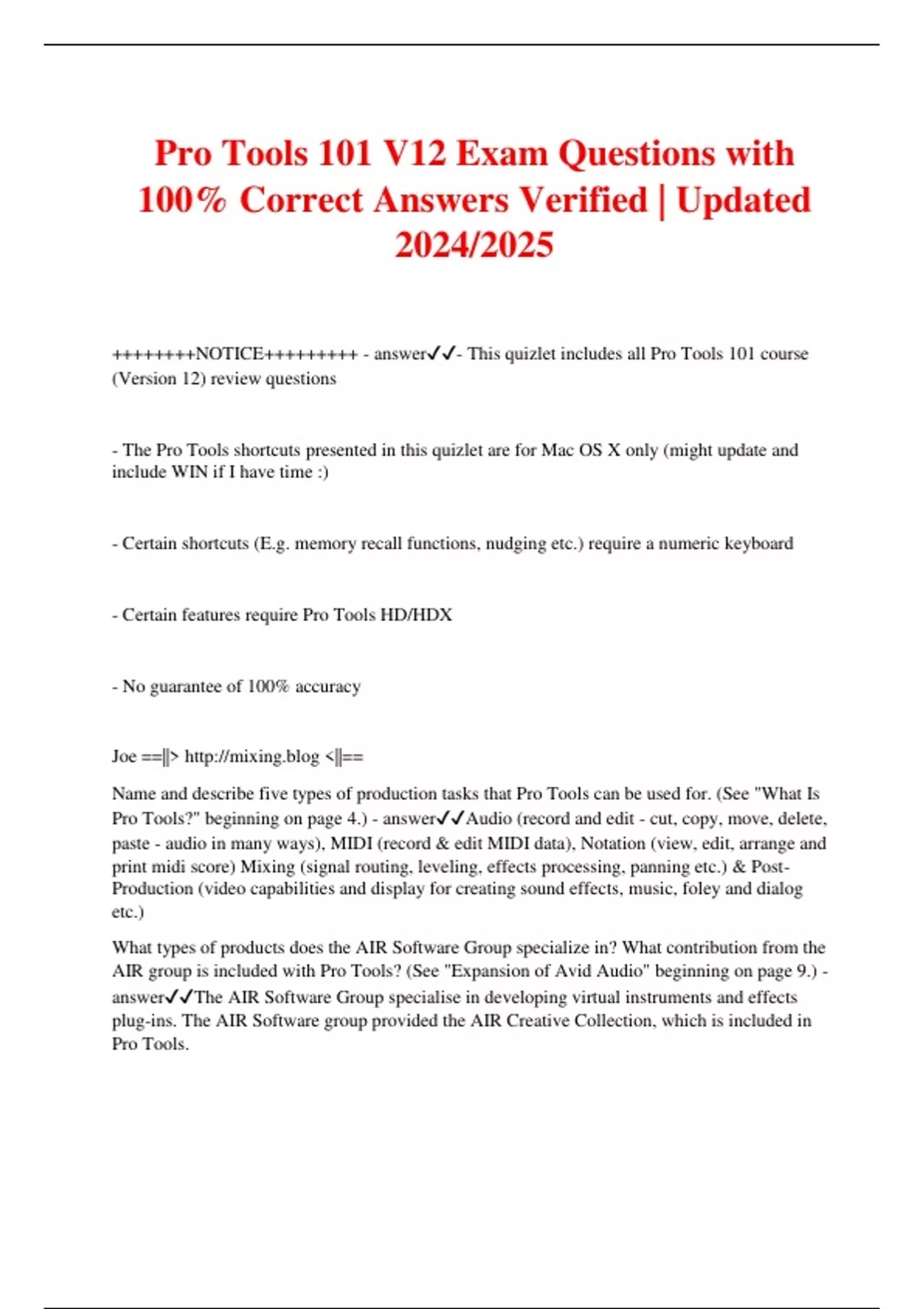 Pro Tools 101 V12 Exam Questions with 100% Correct Answers Verified | Updated 2024/2025 ++++++++NOTICE+++++++++ - answer- This quizlet includes all Pro Tools 101 course (Version 12) review questions - The Pro Tools shortcuts presented in this quizlet are for Mac OS X only (might update and include WIN if I have time :) - Certain shortcuts (E.g. memory recall functions, nudging etc.) require a numeric keyboard - Certain features require Pro Tools HD/HDX - No guarantee of 100% accuracy Joe ==||> <||== Name and describe five types of production tasks that Pro Tools can be used for. (See "What Is Pro Tools?" beginning on page 4.) - answerAudio (record and edit - cut, copy, move, delete, paste - audio in many ways), MIDI (record & edit MIDI data), Notation (view, edit, arrange and print midi score) Mixing (signal routing, leveling, effects processing, panning etc.) & Post- Production (video capabilities and display for creating sound effects, music, foley and dialog etc.) What types of products does the AIR Software Group specialize in? What contribution from the AIR group is included with Pro Tools? (See "Expansion of Avid Audio" beginning on page 9.) - answerThe AIR Software Group specialise in developing virtual instruments and effects plug-ins. The AIR Software group provided the AIR Creative Collection, which is included in Pro Tools. What is the frequency range of human hearing? (See "Basic Parameters of Sound: Waveform, Frequency, and Amplitude" beginning on page 13.) - answerThe frequency range of human hearing is 20 Hz to 20000 Hz. What does the frequency of a sound wave affect in terms of how we perceive the sound? How is frequency measured? (See "Basic Parameters of Sound: Waveform, Frequency, and Amplitude" beginning on page 13.) - answerThe frequency of the sound pressure variations that reaches our ears creates our perception of the pitch of the sound. What does the amplitude of the sound wave affect? How is amplitude measured? (See "Basic Parameters of Sound: Waveform, Frequency, and Amplitude" beginning on page 13.) - answerAs the amplitude of pressure variations increases, the sound becomes louder. Amplitude is measured in decibels (dB). How does the sample rate of a system relate to the frequency of audio it can capture? What is the name of the law that specifies the relationship between sample rate and audio frequency? (See "How Sample Rate Affects Frequency Resolution" beginning on page 14.) - answerA systems sampling rate must be twice the highest frequency it needs to capture. The theory is often referred to as Nyquist Theorem or Sampling Theorem. How does the bit depth of a system relate to the dynamic range of audio it can capture? How can you estimate the dynamic range of a system? (See "How Bit Depth Affects Amplitude Resolution" beginning on page 14.) - answerThe more bit depth the more dynamic range the system can capture. Multiplying bit depth by 6 can estimate the dynamic range available in dB. (6x16 bit = 96dB dynamic range) What are some common digital connections available on Pro Tools audio interfaces? What type of connector jack does each use? (See "Recording in Digital Format" on page 15.) - answerCommon digital connections include S/PDIF - Sony/Philips Digital Interface - (Using RCA Jacks aka coaxial Jacks) and AES/EBU (Using XLR-type connectors). Name some audio interfaces that are compatible with standard Pro Tools software. (See "Audio Interface Options (Non-HD)" beginning on page 16.) - answerAudio interfaces available for Pro Tools|First and standard Pro Tools software include the Pro Tools|Fast Track family, the Pro Tools|Mbox family, the Pro Tools|Eleven Rack, the Pro Tools|Duet and Quartet, and various third party options. Name some audio interfaces that are compatible with Pro Tools HD software. (See "Pro Tools 1 HD - Series Audio Interfaces" beginning on page 19.) - answerPro Tools HD/HDX system require at least one HD-series audio interface to be connected in order to run. Pro Tools HD Compatible interfaces include HD OMNI, HD I/O and HD MADI. Name some of the folders and files that Pro Tools creates as part of the session hierarchy. Where is the session file (.ptx) stored? (See "Session Components" beginning on page 29.) - answerPro Tools generates a session file inside a session folder of the same name (.ptx extension). Further Pro Tools generates a wavecache file (.wfm extension) saved in the session folder. Audio files are stored in the corresponding sessions' audio files folder. MIDI data is stored within the session file (unless exported, subsequently .mid extension). Sibelius files can be exported an recognized by their .sib extension. Bounced files are saved in the bounced files folder (Folder remains empty and will be removed if no audio was bounced). Clip groups folder will remain only when clip groups are exported from the session. Rendered files: when users render elastic audio processing Pro Tools creates temporary files for the audio on the affected tracks. When commited the temporary files are written in the audio files folder. What is the WaveC file used for? What happens if the WaveCache file gets deleted or goes missing? (See "WaveCache File" beginning on page 29.) - answerPro Tools generates the wavecache (.wfm extension) to generate a representation of the sessions audio waveforms in order to save time when opening a session. Deleting the file does not corrupt the session, however Pro Tools will need longer time recalculating the waveform graphics. Where are audio files stored in the session hierarchy? (See "Audio Files" beginning on page 29.) - answerAudio files are stored in the session folders audio files folder. Where are Pro Tools' MIDI files normally stored? (See "MIDI Files" beginning on page 29.) - answerMIDI files are stored within the session file in the session folder. However users can export the MIDI files, which will then become available as .mid files. Which component should you turn on first when powering up a