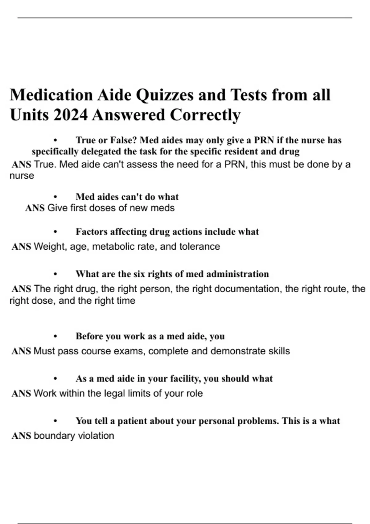 Medication Aide quizzes and tests from all units Over 250 Questions and Answers (2023/2024) 100% Correctly Done