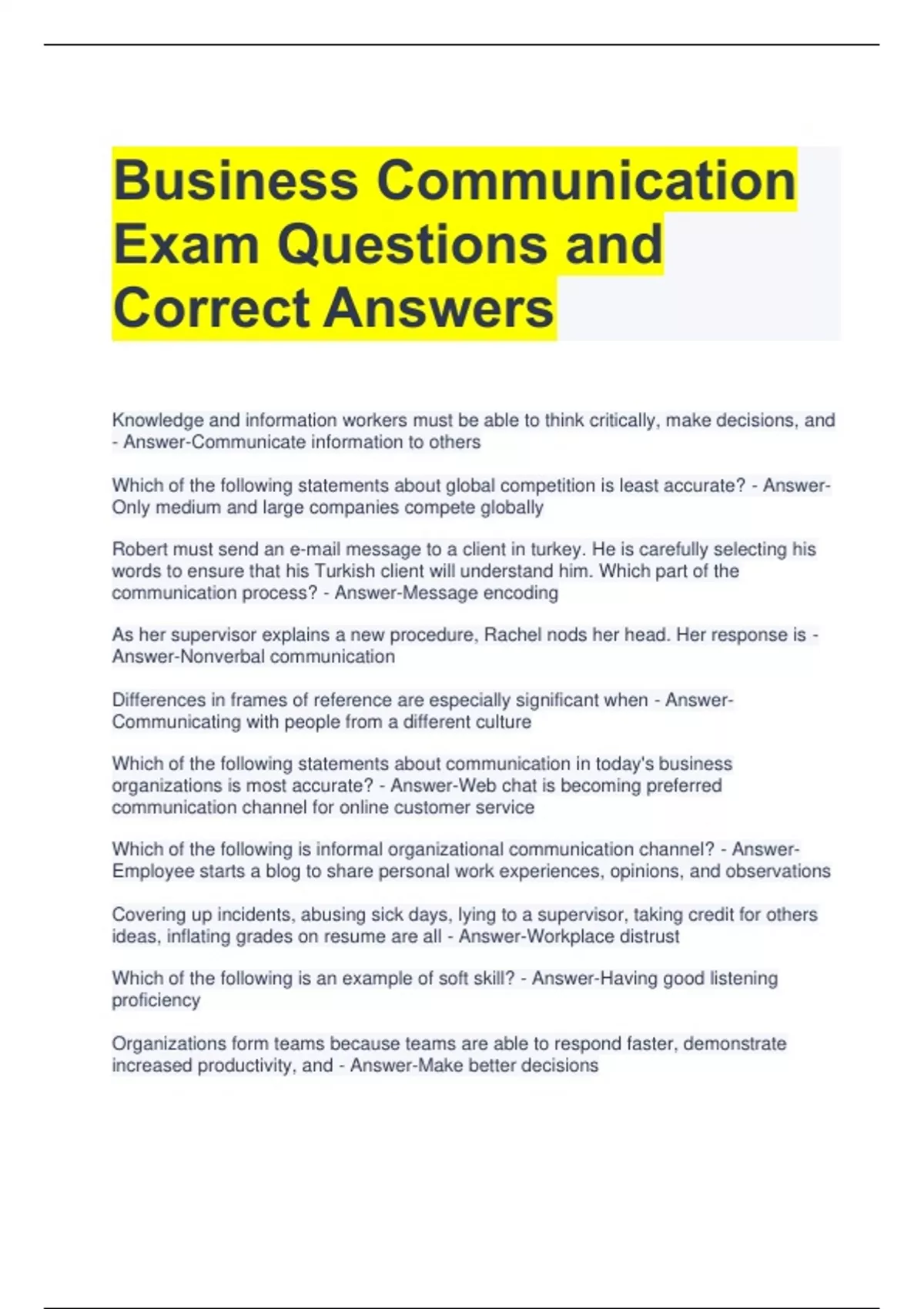 Knowledge and information workers must be able to think critically, make decisions, and - Answer-Communicate information to others Which of the following statements about global competition is least accurate? - AnswerOnly medium and large companies compete globally Robert must send an e-mail message to a client in turkey. He is carefully selecting his words to ensure that his Turkish client will understand him. Which part of the communication process? - Answer-Message encoding As her supervisor explains a new procedure, Rachel nods her head. Her response is - Answer-Nonverbal communication Differences in frames of reference are especially significant when - AnswerCommunicating with people from a different culture Which of the following statements about communication in today's business organizations is most accurate? - Answer-Web chat is becoming preferred communication channel for online customer service Which of the following is informal organizational communication channel? - AnswerEmployee starts a blog to share personal work experiences, opinions, and observations Covering up incidents, abusing sick days, lying to a supervisor, taking credit for others ideas, inflating grades on resume are all - Answer-Workplace distrust Which of the following is an example of soft skill? - Answer-Having good listening proficiency Organizations form teams because teams are able to respond faster, demonstrate increased productivity, and - Answer-Make better decisions