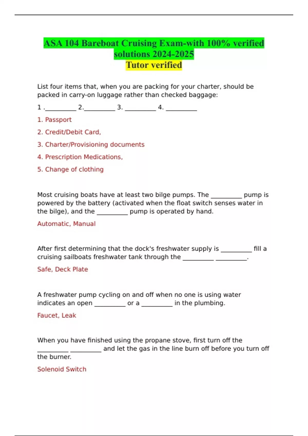 ASA 104 Bareboat Cruising Exam-with 100% verified solutions