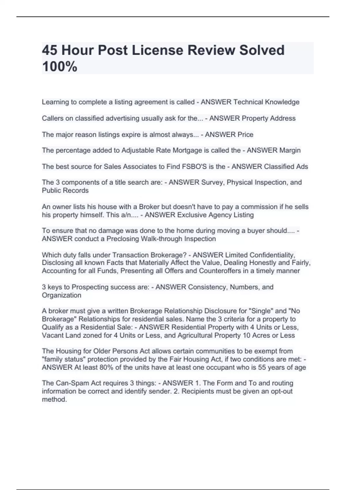 Learning to complete a listing agreement is called - ANSWER Technical Knowledge Callers on classified advertising usually ask for the... - ANSWER Property Address The major reason listings expire is almost always... - ANSWER Price The percentage added to Adjustable Rate Mortgage is called the - ANSWER Margin The best source for Sales Associates to Find FSBO'S is the - ANSWER Classified Ads The 3 components of a title search are: - ANSWER Survey, Physical Inspection, and Public Records An owner lists his house with a Broker but doesn't have to pay a commission if he sells his property himself. This a/n.... - ANSWER Exclusive Agency Listing To ensure that no damage was done to the home during moving a buyer should.... - ANSWER conduct a Preclosing Walk-through Inspection Which duty falls under Transaction Brokerage? - ANSWER Limited Confidentiality, Disclosing all known Facts that Materially Affect the Value, Dealing Honestly and Fairly, Accounting for all Funds, Presenting all Offers and Counteroffers in a timely manner 3 keys to Prospecting success are: - ANSWER Consistency, Numbers, and Organization A broker must give a written Brokerage Relationship Disclosure for "Single" and "No Brokerage" Relationships for residential sales. Name the 3 criteria for a property to Qualify as a Residential Sale: - ANSWER Residential Property with 4 Units or Less, Vacant Land zoned for 4 Units or Less, and Agricultural Property 10 Acres or Less The Housing for Older Persons Act allows certain communities to be exempt from "family status" protection provided by the Fair Housing Act, if two conditions are met: - ANSWER At least 80% of the units have at least one occupant who is 55 years of age The Can-Spam Act requires 3 things: - ANSWER 1. The Form and To and routing information be correct and identify sender. 2. Recipients must be given an opt-out method.
