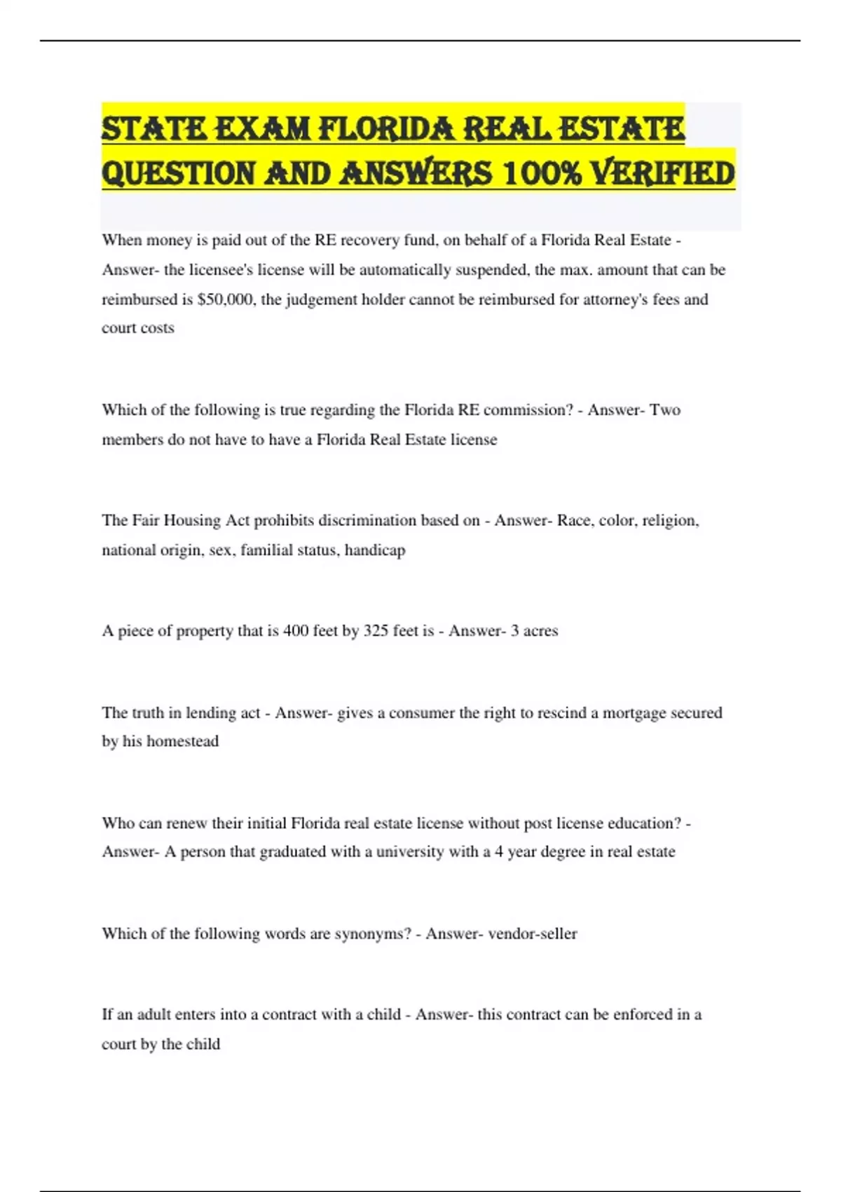When money is paid out of the RE recovery fund, on behalf of a Florida Real Estate - Answer- the licensee's license will be automatically suspended, the max. amount that can be reimbursed is $50,000, the judgement holder cannot be reimbursed for attorney's fees and court costs Which of the following is true regarding the Florida RE commission? - Answer- Two members do not have to have a Florida Real Estate license The Fair Housing Act prohibits discrimination based on - Answer- Race, color, religion, national origin, sex, familial status, handicap A piece of property that is 400 feet by 325 feet is - Answer- 3 acres The truth in lending act - Answer- gives a consumer the right to rescind a mortgage secured by his homestead Who can renew their initial Florida real estate license without post license education? - Answer- A person that graduated with a university with a 4 year degree in real estate Which of the following words are synonyms? - Answer- vendor-seller If an adult enters into a contract with a child - Answer- this contract can be enforced in a court by the child Price Fixing is - Answer- a violation of Sherman-clayton antitrust law In a joint tenancy - Answer- has the right of survivorship and owners acquire interest at the same time An expressed contract - Answer- is unambiguous To become the chairman of the Florida Real Estate Commission - Answer- a member is elected by his or her peers A florida Real Estate license - Answer- has an expiration date on it, expires biennially, serves as prima facie evidence that the holder is properly licensed Florida Real estate licensee cannot promise to re-purchase property back in the future unless - Answer- a guaranteed re-purchae agreement has been approved by the state of florida A florida real estate salesman must turn escrow money over to his broker - Answer- before the end of the business day following the day he received the money A florida real estate broker can have - Answer- an interest bearing escrow account Which of the following would a buyer certainly not get at closing - Answer- certificate of title When the gov. exercises the power of eminent domain, which of the following statements is NOT true - Answer- Homestead will protect a widow from eminent domain
