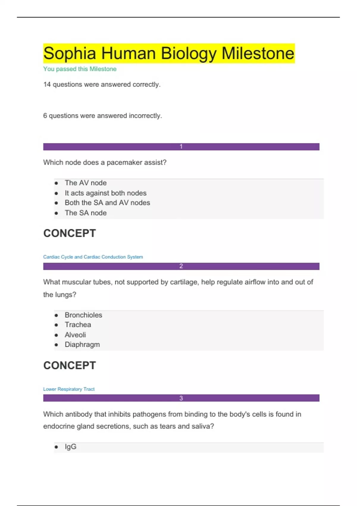 Sophia Human Biology Milestone You passed this Milestone 14 questions were answered correctly. 6 questions were answered incorrectly. 1 Which node does a pacemaker assist? CONCEPT Cardiac Cycle and Cardiac Conduction System 2 What muscular tubes, not supported by cartilage, help regulate airflow into and out of the lungs? CONCEPT Lower Respiratory Tract 3 Which antibody that inhibits pathogens from binding to the body's cells is found in endocrine gland secretions, such as tears and saliva? CONCEPT Humoral Immunity 4 What is the function of the capillaries? CONCEPT Cardiovascular System 5 Monoclonal antibodies and can be used to treat certain types of cancers in a process known as immunotherapy. CONCEPT Organ Transplant and Immunotherapy 6