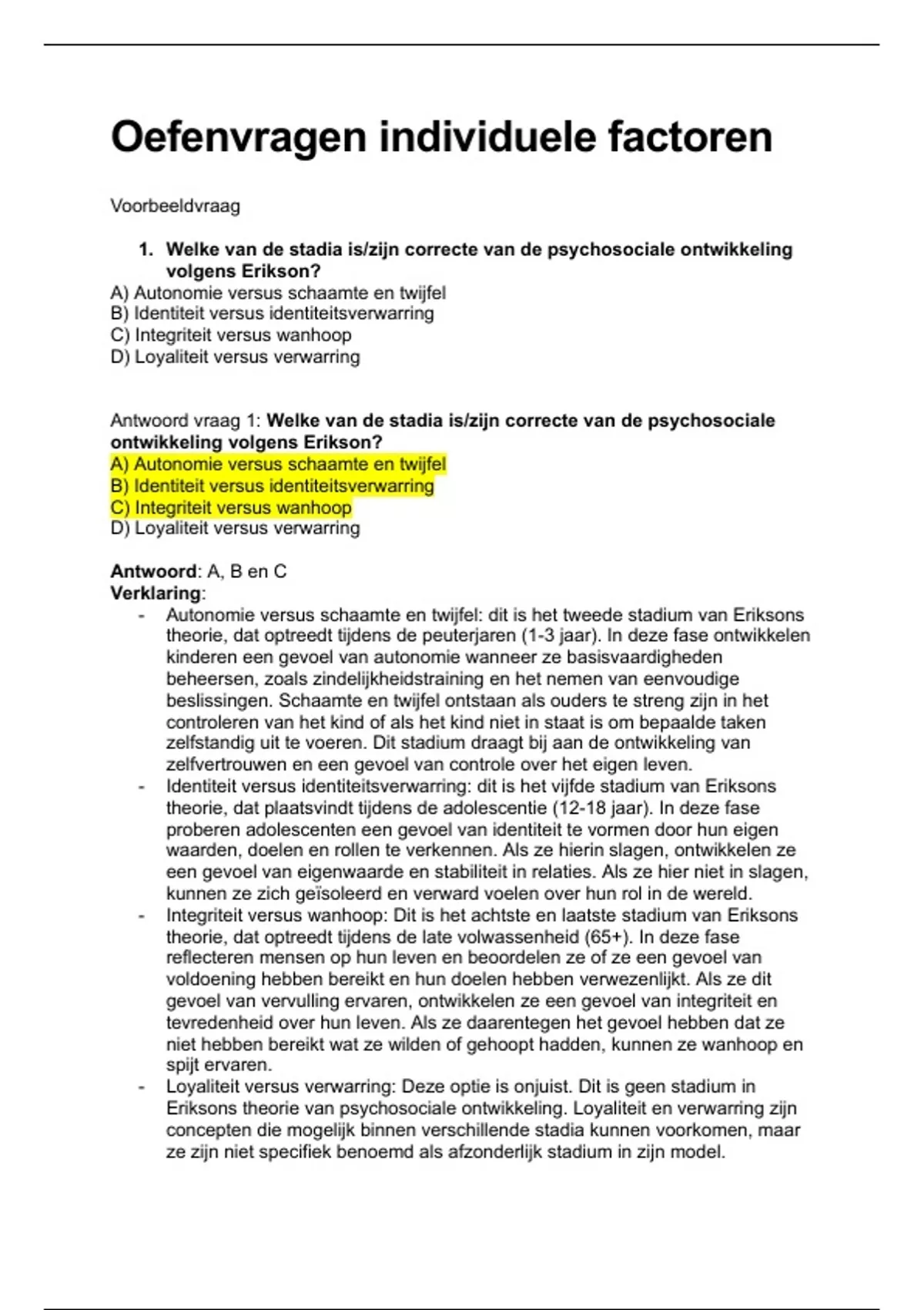 1. Welke van de stadia is/zijn correcte van de psychosociale ontwikkeling