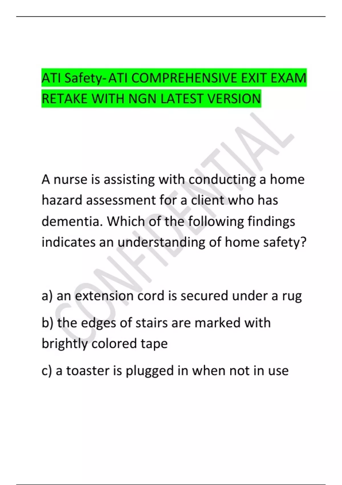 ATI Safety- ATI COMPREHENSIVE EXIT EXAM RETAKE WITH NGN LATEST VERSION