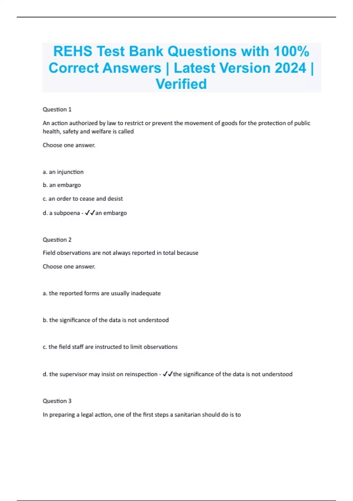 Question 1 An action authorized by law to restrict or prevent the movement of goods for the protection of public health, safety and welfare is called Choose one answer. a. an injunction b. an embargo c. an order to cease and desist d. a subpoena - an embargo Question 2 Field observations are not always reported in total because Choose one answer. a. the reported forms are usually inadequate b. the significance of the data is not understood c. the field staff are instructed to limit observations d. the supervisor may insist on reinspection - the significance of the data is not understood